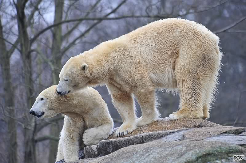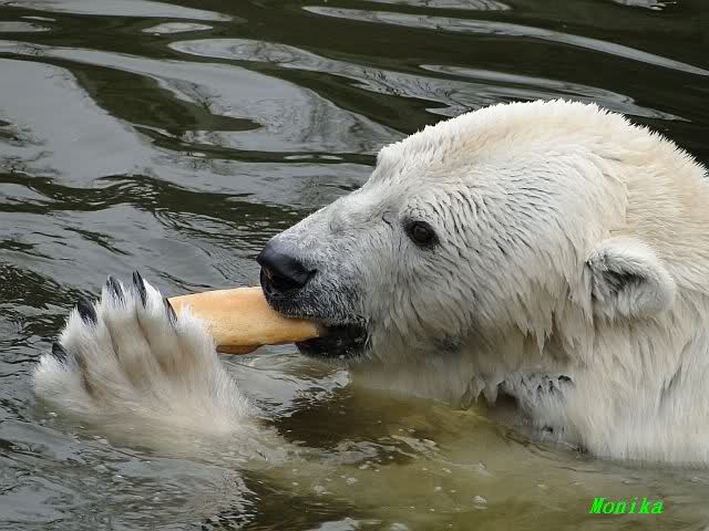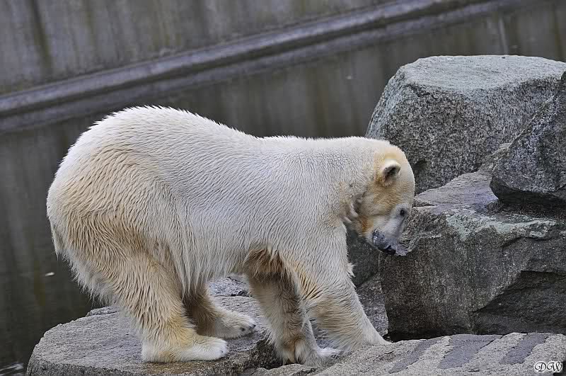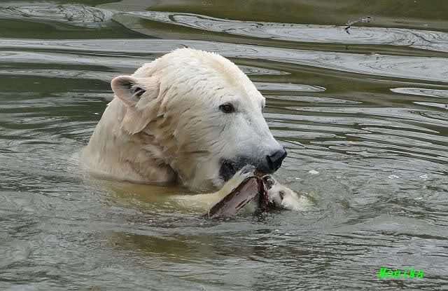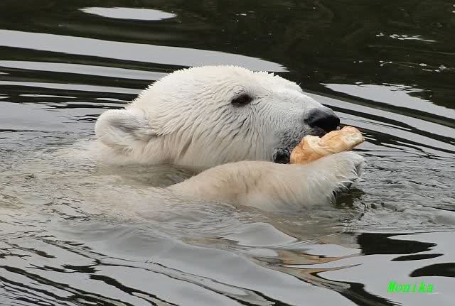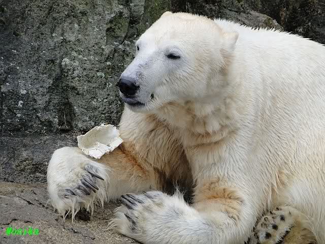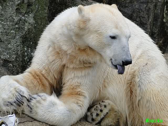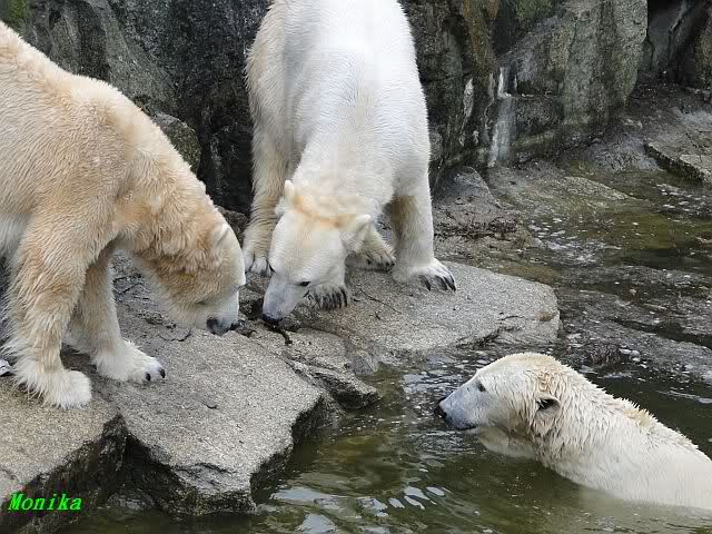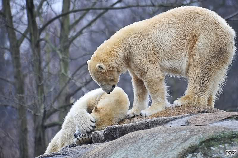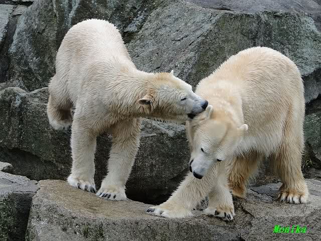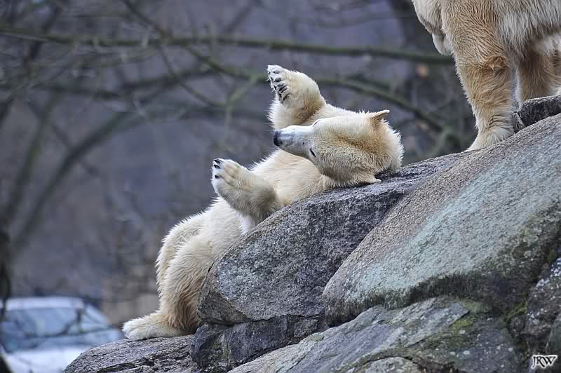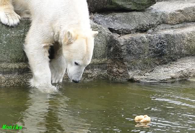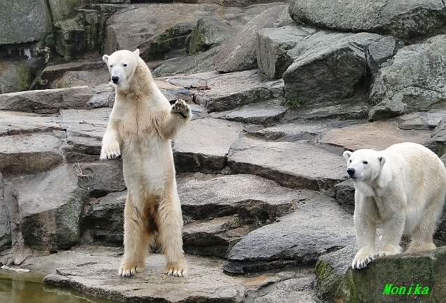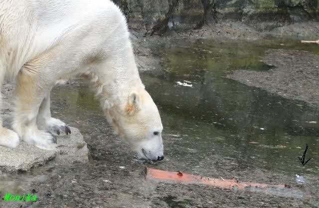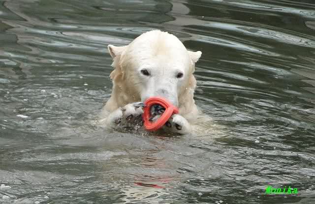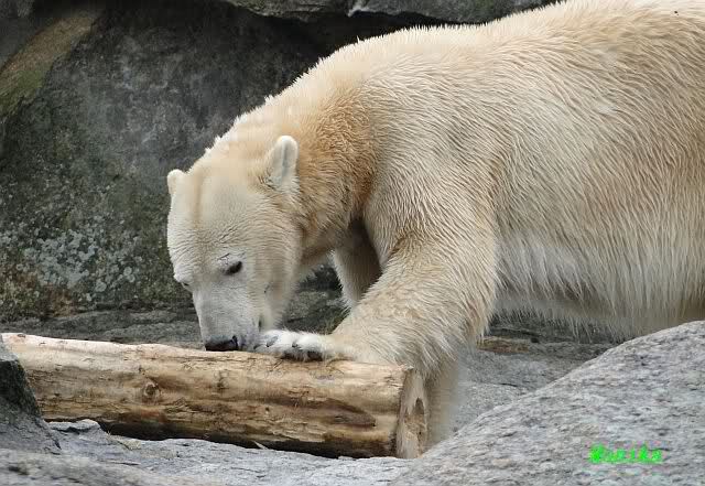 Als Knut einen Spaziergang auf der Anlage unternahm, lauerte Katjuscha schon um ihn zu jagen. Ich stand leider auf der verkehrten Seite und konnte die Beiden nicht sehen. Nur das Brummen war nicht zu überhören. Andere Knutfreunde erzählten mir, dass Nancy sich zwischen Knut und Kati stellte und auch etwas brummte. Kati ist dann gegangen. Das soll sie gestern schon einmal gemacht haben. Siieht ganz so aus, als ob Nancy auch so eine Art "Mutterrolle" für Knut übernommen hat.