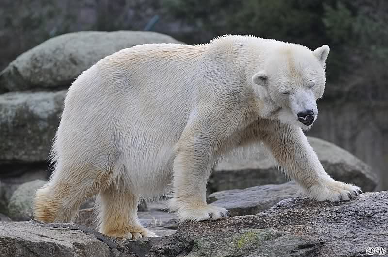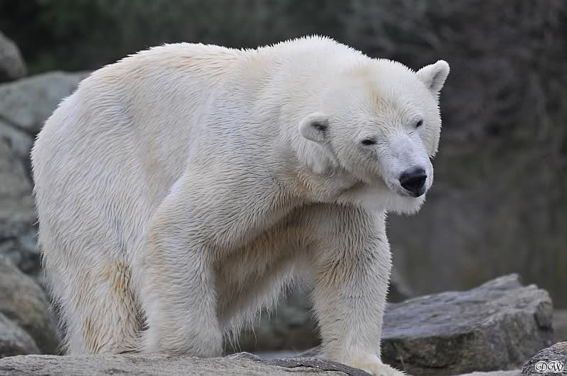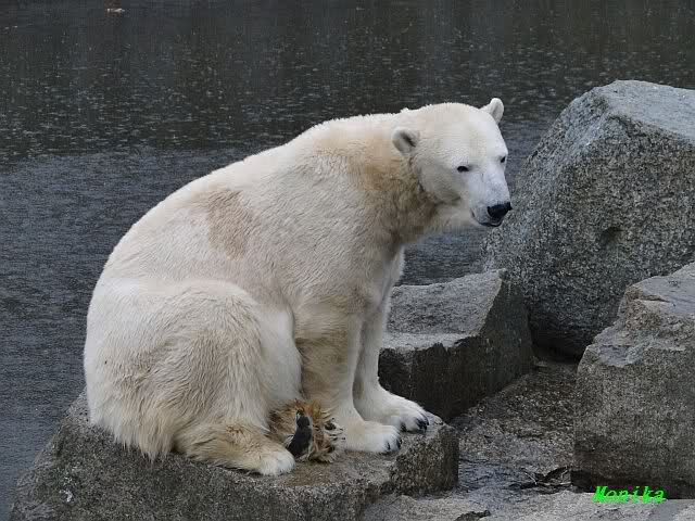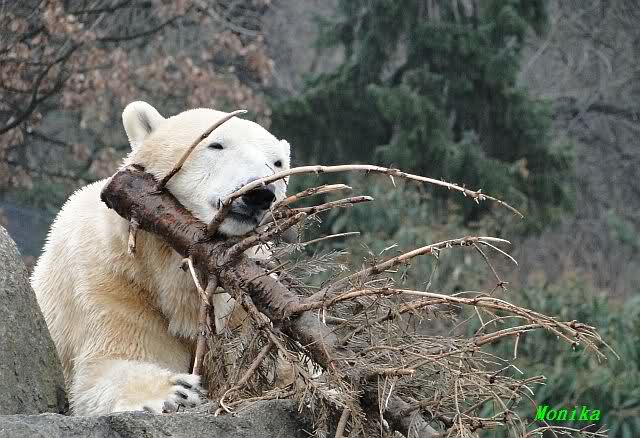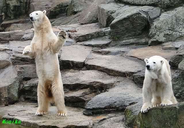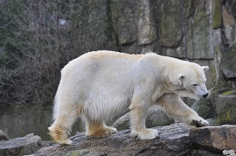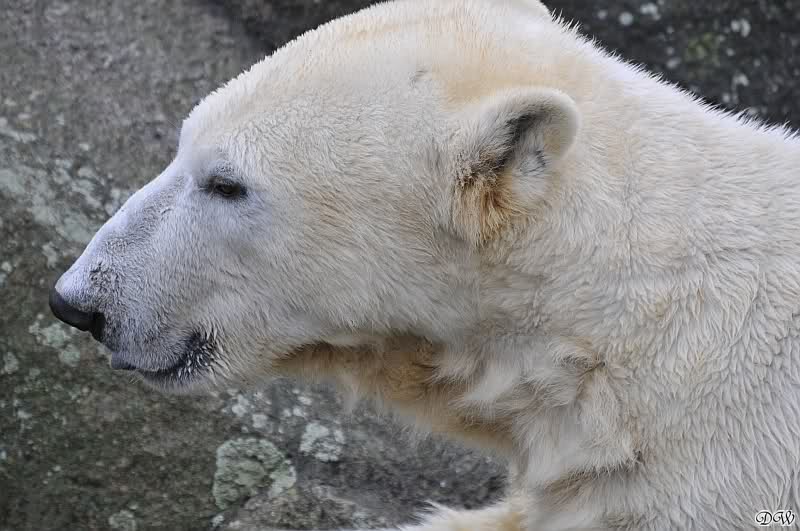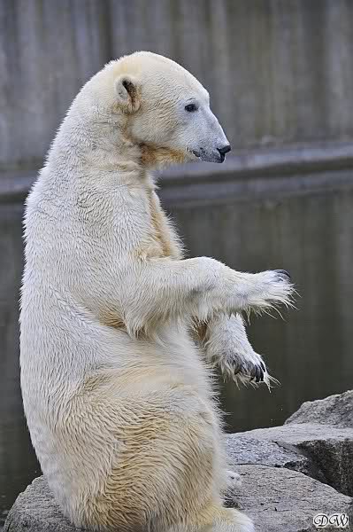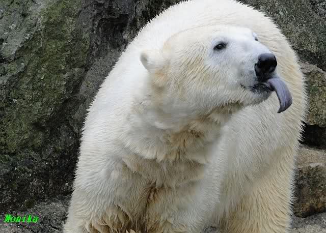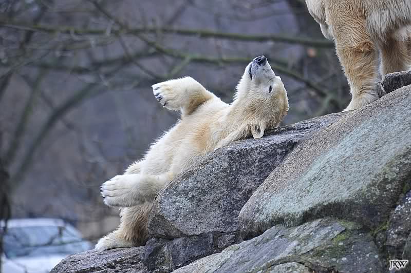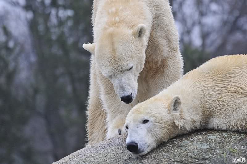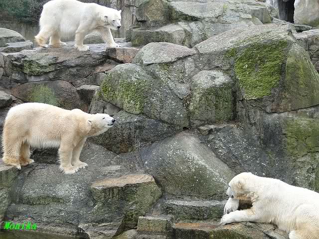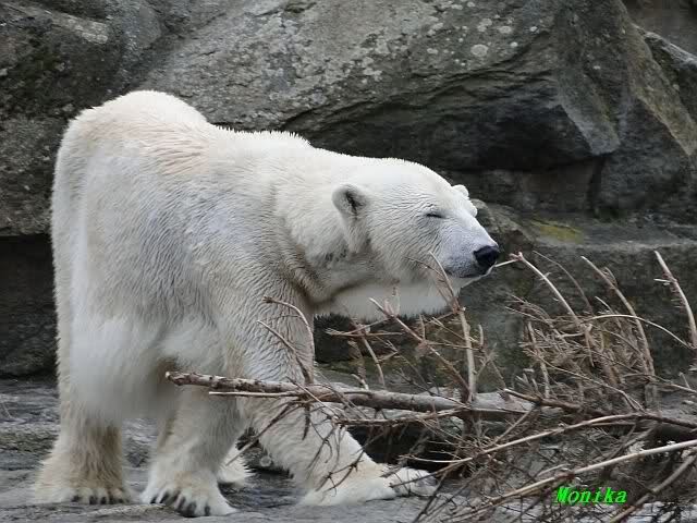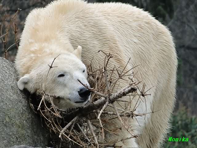 Als Knut einen Spaziergang auf der Anlage unternahm, lauerte Katjuscha schon um ihn zu jagen. Ich stand leider auf der verkehrten Seite und konnte die Beiden nicht sehen. Nur das Brummen war nicht zu überhören. Andere Knutfreunde erzählten mir, dass Nancy sich zwischen Knut und Kati stellte und auch etwas brummte. Kati ist dann gegangen. Das soll sie gestern schon einmal gemacht haben. Siieht ganz so aus, als ob Nancy auch so eine Art "Mutterrolle" für Knut übernommen hat.