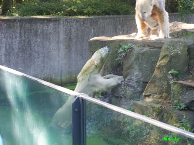Das war heute Morgen schon eine Riesenüberraschung. Knut und Gianna gemeinsam im Wasser. Als Knut in der linken Kurve im Wasser wie angewurzelt saß, kam Gianna lässig um die Ecke geschwommen. Knut brachte sich dann doch in "Sicherheit" nach oben. Es war schon schön anzusehen, wie nahe sich die Beiden heute kamen. Gianna gab sich ganz cool und ging immer wieder auf Knut zu, der ein paarmal etwas schnaufte und dabei 3 Schritte zurück lief. Er wurde nur etwas mutiger, als Gianna ihm den Rücken zudrehte. Gianna drehte immer wieder ganz ruhig ihre Runden im Wasser und Knut schaute von oben zu. Ab und zu sah es so aus, als wolle er auch ins Wasser, aber sobald Gianne in Sicht war, machte er wieder einen Rückzieher.