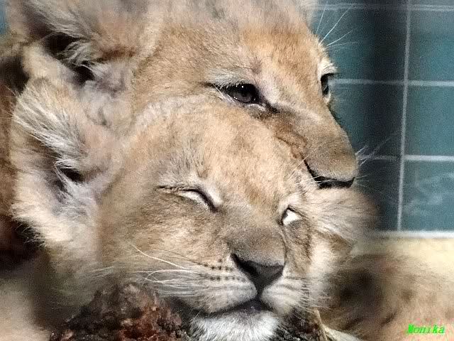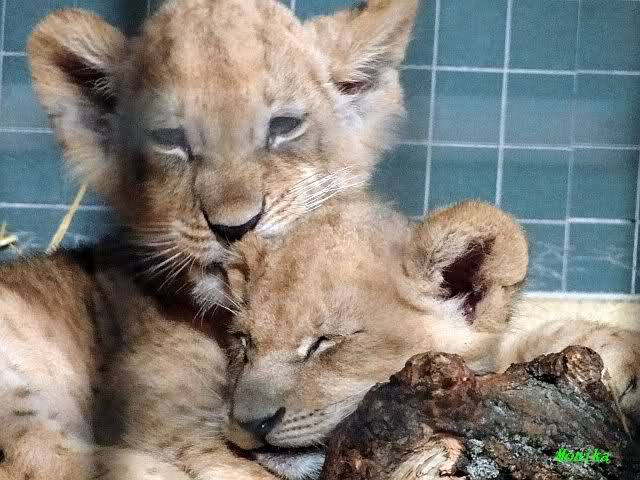 Die beiden Löwenkinder lagen eng aneinander gekuschelt im Stroh. Der eine ist deutlich größer. Er nuckelte am Ohr des kleineren, so wie Nancy bei Tosca.