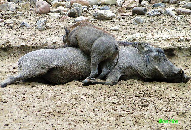 Nach einer kleinen Pause gingen wir zum Erweiterungsgelände. Das ist auch immer wieder schön. Wir sahen die kleinen Wasserschweine, sie machten einen munteren Eindruck. Auf dem Rückweg schauten wir bei den Nashörnern vorbei. Ine hatte männliche Gesellschaft. Aber nicht Kito, sondern Nashornbulle Jasper. Allerdings zeigte er gestern kein großes Interesse an seiner Partnerin. Er guckte sich lieber die Besucher an, die vor der Anlage standen. Ine hingegen zerdepperte mit den Vorderbeinen einen großen, trockenen Ast. Irgendwo muss Frau ja hin mit ihrem Frust.