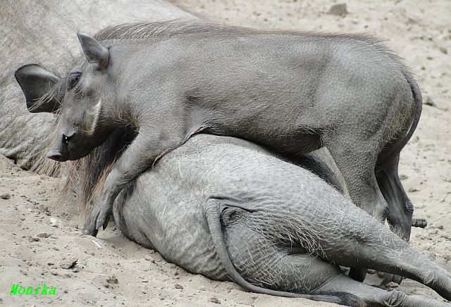 Die kleinen Warzenschweine frühstücken an der Milchbar