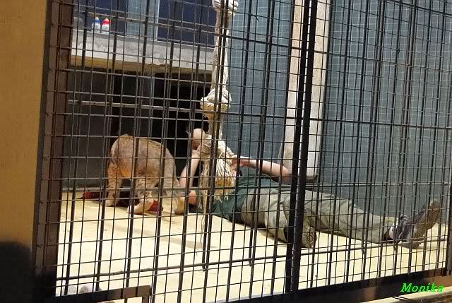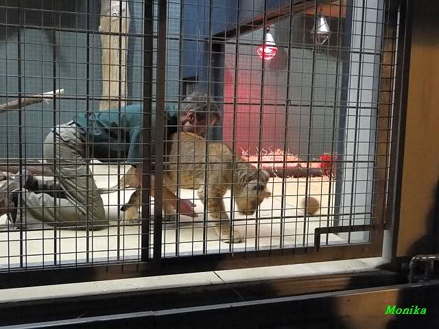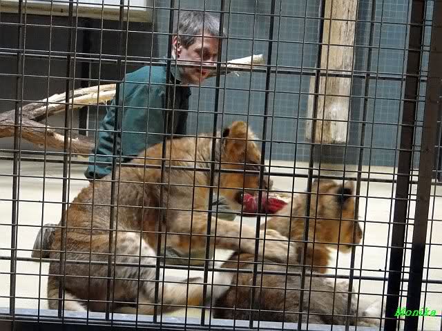 Obwohl die Löwenkinder schon mächtig gewachsen sind, bekommen sie noch die Flasche. Und Spielrunden mit den Pflegern finden auch noch statt. Heute spielten sie unter anderem mit einer Kokosnuss. Die Pfleger rollten sie von einem Käfig zum anderen hin und her. Ich hatte manchmal den Eindruck, dass die Pfleger fast mehr Spaß an dem Spiel hatten als die Löwen.