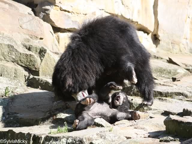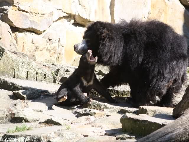 Die drei Lippenbären, die sich das Gehege künftig mit den Schakalen teilen, sind erst seit Apri 2009 im Naturzoo Rheine. Das 12-jährige Weibchen Kama kommt aus dem Berliner Zoo, der dreijährige Franz und die zweijährige Myrthe lebten vorher in Leipzig. Die Tiere reisten in einem Spezialtransporter mit Klima-Anlage nach NRW und mussten sich zunächst im Innengehege eingewöhnen.