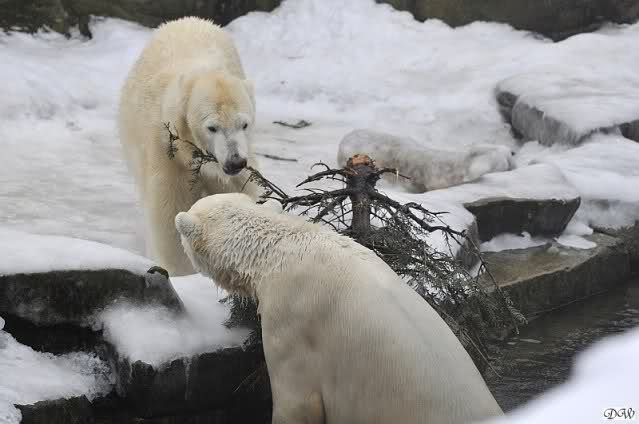 Heute früh um 9.00 Uhr waren die Beiden schon kräftig am toben. Man sah sie schon von weitem über die Anlage rennen. Durch das leichte Tauwetter war es nicht mehr ganz so glatt. Gianna holte den Tannenbaum wieder nach oben. Sie spielten, rauften und schmusten den ganzen Vormittag. Gegen 11.30 Uhr waren Knut und Gianna erschöpft und legten sich hin.