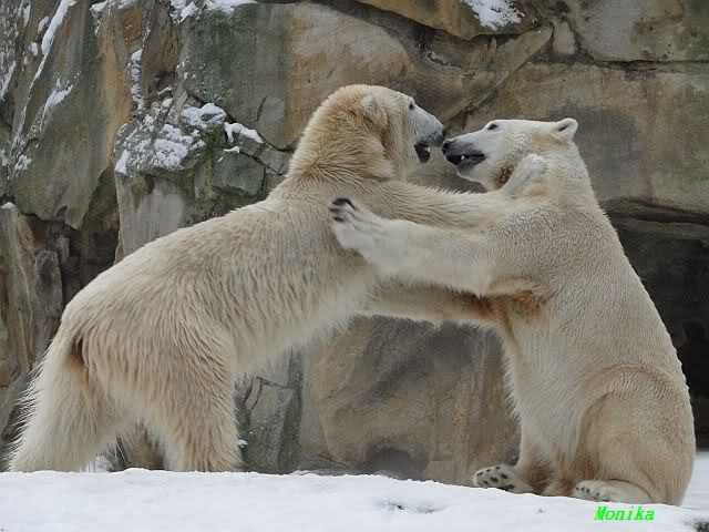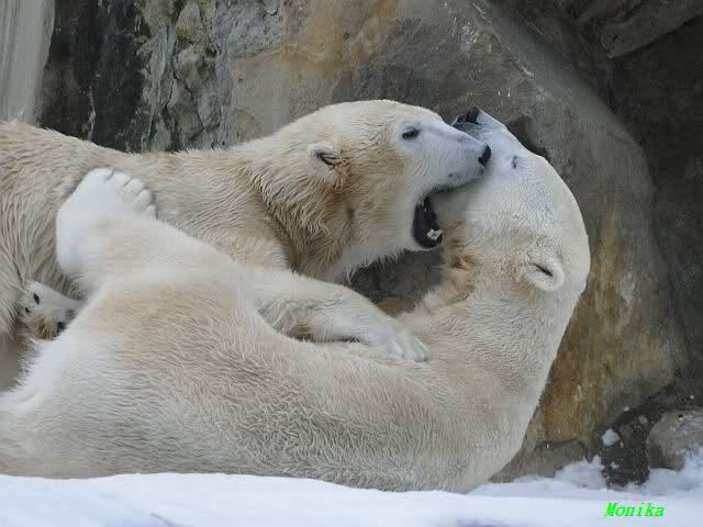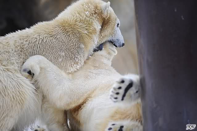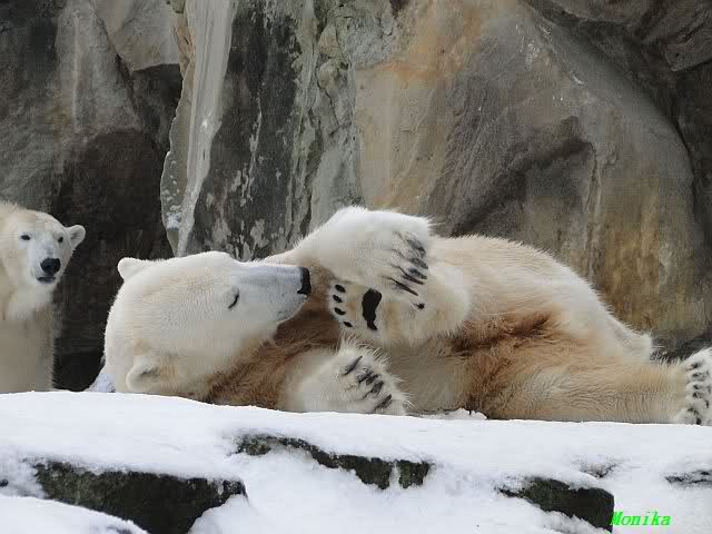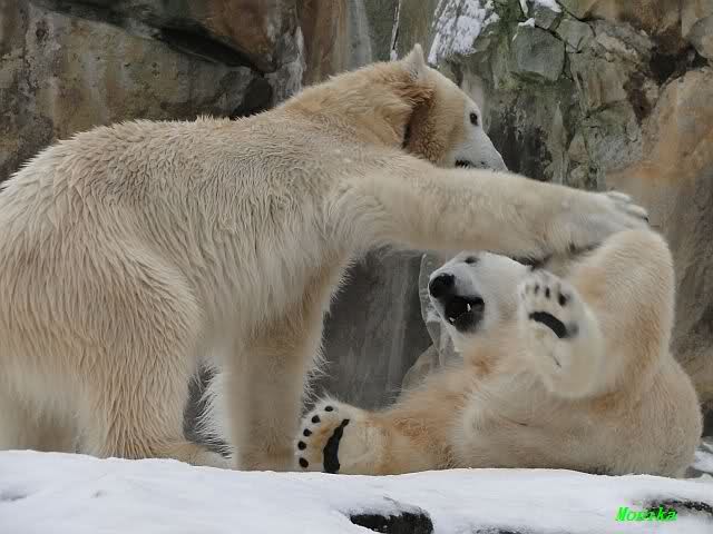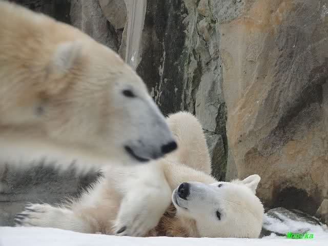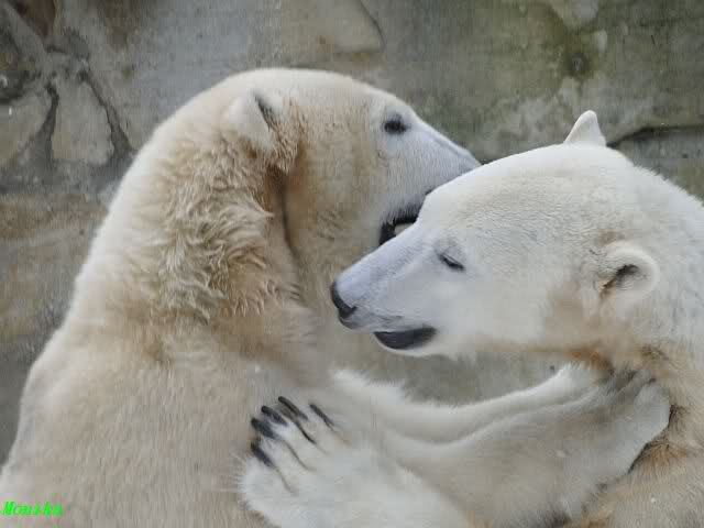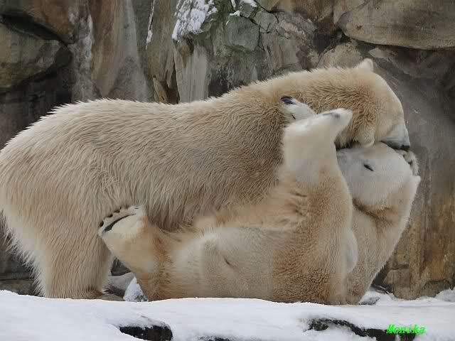 Trotzdem traf ich kurz nach zehn wohlbehalten im Zoo ein. Im Zoo war es heute wunderschön, es waren kaum Leute da. Vor Knuts Gehege standen lediglich drei Stammbesucher. Knut und Gianna störte das nicht im Geringsten. Sie waren zusammen im Wasser und spielten und tobten wunderschön. Sie hatten einander umarmt und rangelten wie ein verliebtes Pärchen im Übermut. Ich sah ihnen ein Weilchen zu. Dann ging ich zur Fütterung der großen Eisbären.