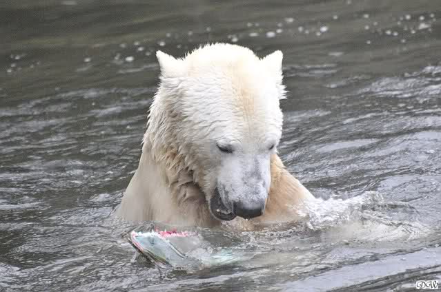 Dann kam Frau Weckert mit dem Futter. Ich bekam eine Privatfütterung geboten, denn ich war immer noch die einzige Besucherin. Das war auch mal sehr schön. Nach der Fütterung redeten Frau Weckert und ich kurz miteinander, auch über Knut und Gianna.