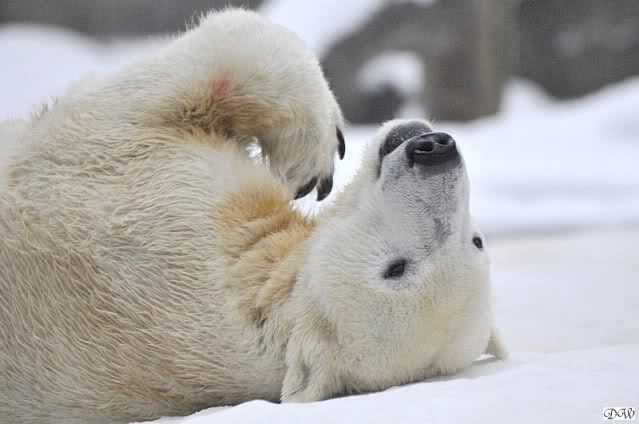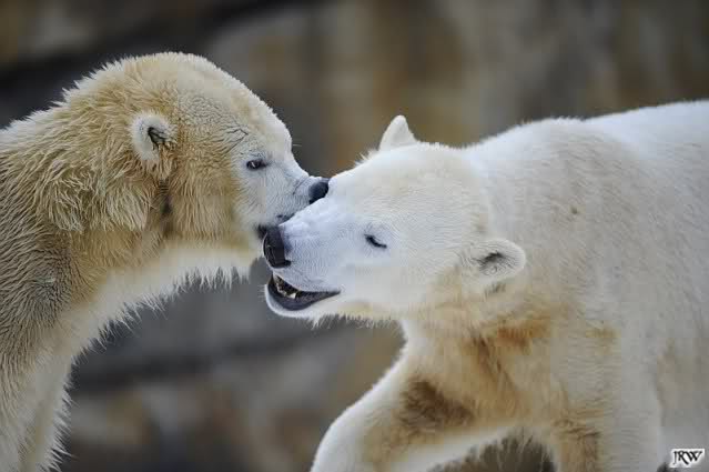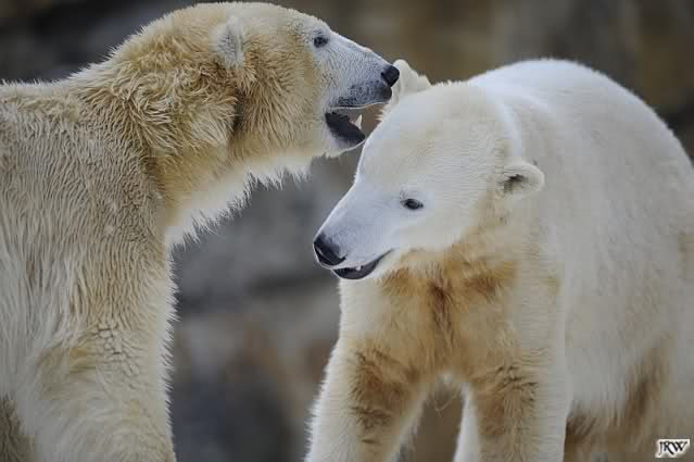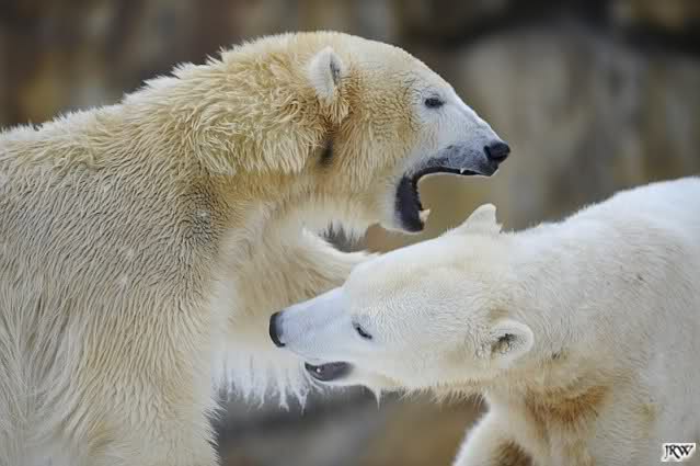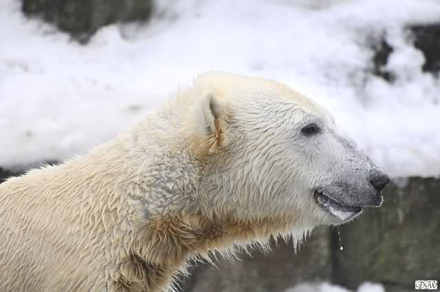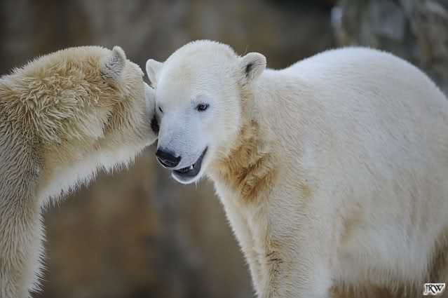 I'd like to send some of Jessie's latest photos to those who claim polar bears have no facial expressions! Look how beautifully Knuti smiles ... and he even laughs....