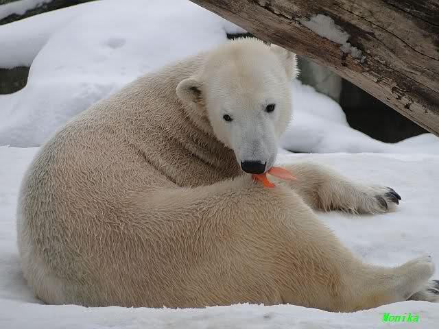 Niemand hat uns hinausgejagt, wir sind auch freiwillig in den Zoo gegangen. Man konnte sehen, dass Knut und Gianna viel gespielt hatten, den Knut hatte HUNGER. Frau Weckert warf ziemlich viele Möhren und auch ein paar Äpfel auf die Anlage, aber Gianna bekam nicht viel davon ab. Knut beeilte sich und fraß bis auf zwei Möhren alles auf. Gianna kam und versuchte ihm eine halbe Möhre aus der Schnauze zu nehmen und fand flugs die paar Stücke und verschlag sie.