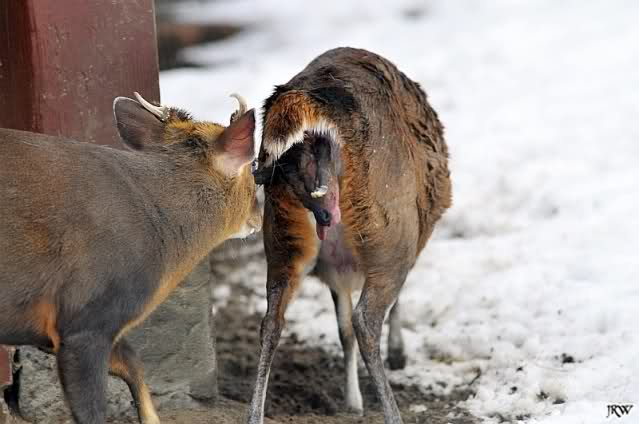 ... wir hörten ein Fiepen bei den Muntjaks. Also schauten wir hin und sahen eine Muntjak-Kuh im Schnee liegen und einen Bock, der sie konstant zu Aufstehen bewegen wollte und sie mit seinen Hörnern anstieß, um sie in den rettenden Stall zu treiben. Sie stand zwar auf und legte sich aber immer wieder hin. Der Vorgang wiederholte sich mehrmals, immer wieder versuchte der Bock, sie aufzubringen.