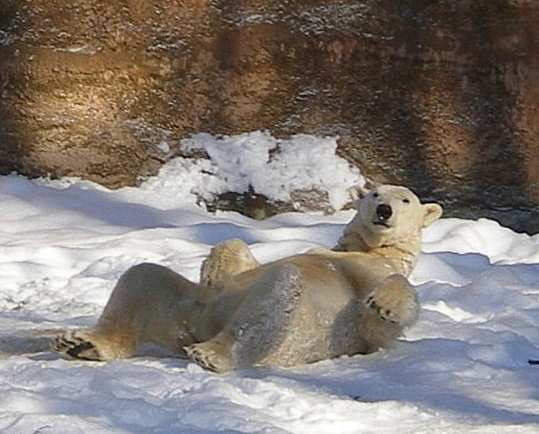 Da sieht man doch, wie wohl sich so ein Eisbär im Schnee fühlt Ich hoffe sehr, dass auch Flocke in diesen Genuss kommen wird, selbstverständlich ist das ja inzwischen nicht mehr. Aber falls es doch schöne verschneite Wintertage geben sollte, kann ich jedem nur empfehlen, dann mal den Tiergarten zu besuchen, es ist einfach herrlich.
