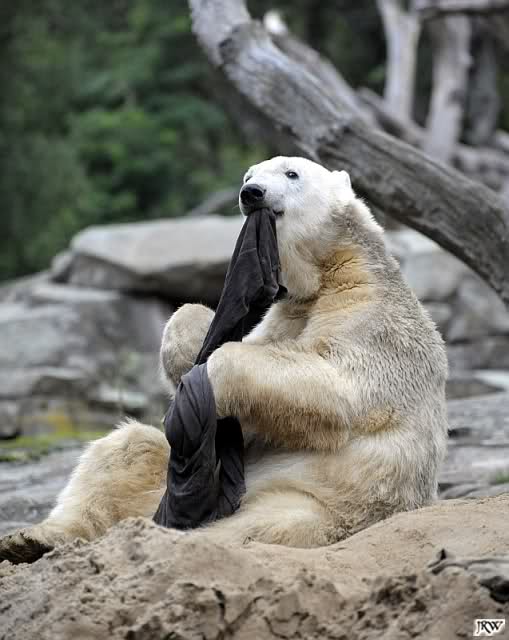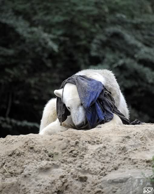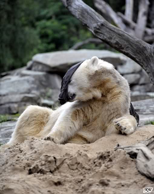 Allerdings war ich auch noch nie so lange im Zoo. Knut fing an zu gärtnern. Er riss Pflanzen aus und trug sie hierhin und dorthin. Dann ging er zu seinem Sandhaufen und begann ihn umzugraben. Er grub schließlich ein Loch, wo genau sein kleiner Hintern hineinpasste. Dann legte er sich hinein, drehte uns den Rücken zu und machte ein Nickerchen. Aber nicht lange.