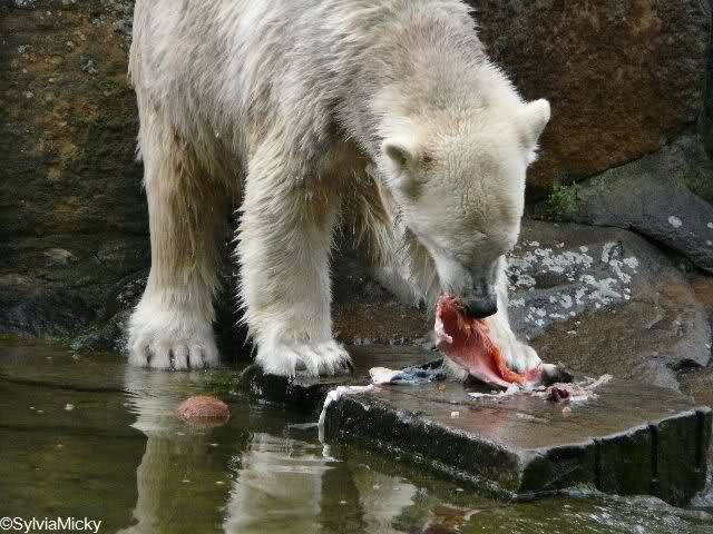 Knut bekam heute ein würdiges Geburtstagsmahl. Der Futtereimer war voll bis obenhin. Ich sah wunderschöne große Weintrauben, Bananen, Fleisch und Fische. Aber obendrauf lag ein riesiger, schöner Lachs. Die Besucher staunten und Herr Dörflein meinte im Spaß, Knut würde besser essen als er selbst.