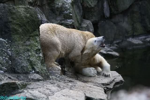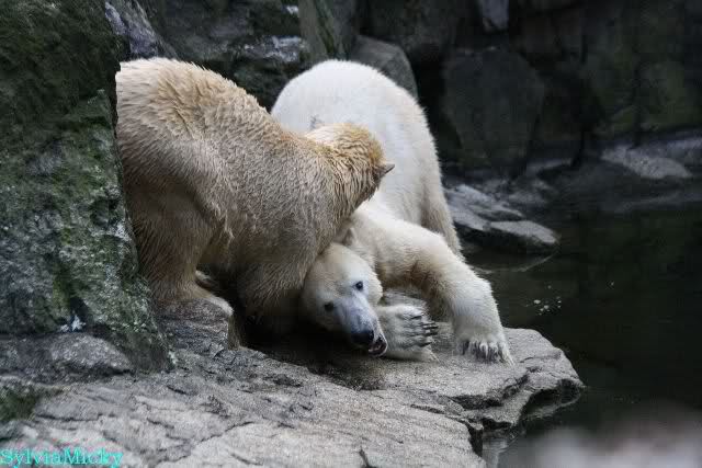 Knut hatte heute nicht viel mit seiner Mutter im Sinn, obwohl sie alle Register zog, um ihn ins Wasser zu locken und zum Spielen zu animieren. Immer, wenn sie ihm zu nahe kam, wurde geschnauft und eine Schippe gezogen. Wird Knut etwa zum flapsigen Teenager, der nicht mehr mit seiner Mutter "abhängen" will? Jedenfalls blieb Knut oben auf den Felsen und machte einen auf ungenießbar.