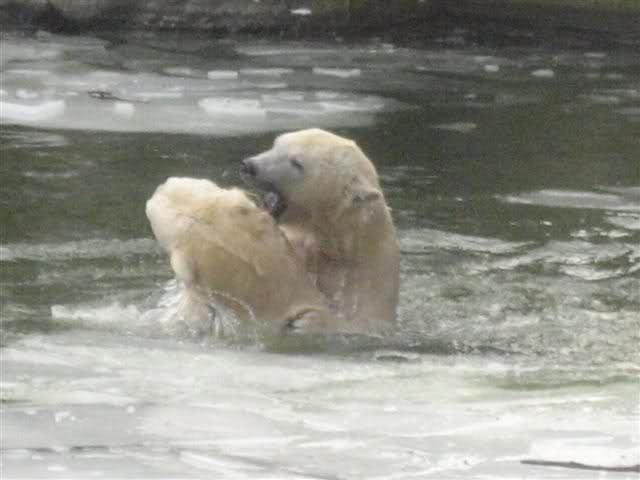 Und heute setzte Knut noch einen drauf und spielt mit Tosca im Wasser. Habe gerade einen Anruf einer Knutfreundin bekommen, die mir diese Neuigkeiten auch erzählte.