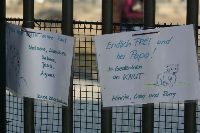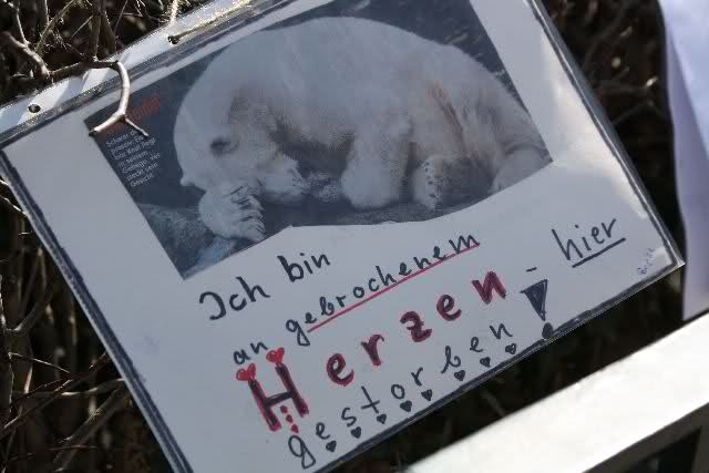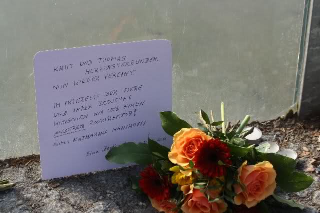 *Knut starb an einer Hirnerkrankung* - wodurch ausgelöst, fragt man sich? *Knut ist ertrunken*, na klar, aber weshalb? Er ist durch diese *Hirnerkrankung* (Schlaganfall ist auch eine Hirnerkrankung) ins Wasser gefallen und ertrunken. Egal, wie die Enduntersuchung ausfällt und ob sie jemals tatsächlich an die Weltöffentlichkeit getragen wird, Knut hatte die letzten Monate viel Stress, das haben viele Besucher tagein, tagaus miterleben müssen. Wir alle sind gegen eine Mauer gelaufen, Knut war bedingungslos der Willkür dieses Direktors ausgesetzt. Armer Knut, aber nun hat er Frieden und wird nicht als *Zuchtbulle* von einem zum anderen Zoo transportiert, damit seine Gene überall verteilt werden. Das ist ihm erspart geblieben, denn die unsensible Meinung des Zoochefs, dass Knut nun nicht mehr als *Zuchttier zur Verfügung steht*, bringt alles zum Ausdruck.