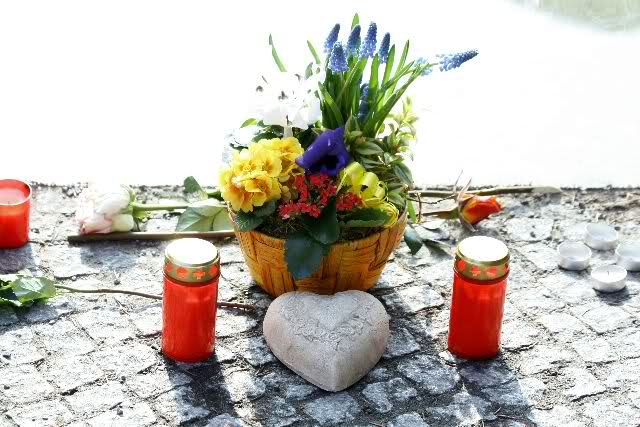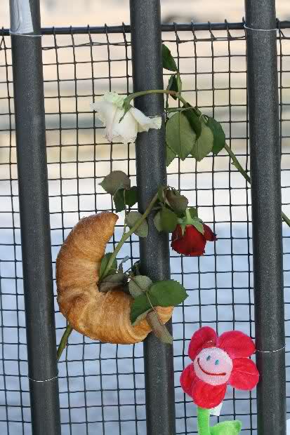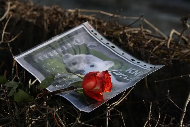 So groß die Trauer ist, und jeder trauert anders, meine Tränen liefen ja auch ohne Ende, heute geht's etwas besser. Aber das Foto mit den Rosen und dem Croissant hat mich schmunzeln lassen. Das drückt soviel Liebe und Hingabe zu Knut aus, und trotz unendlicher Trauer doch auch Humor. Und der schadet nie...Und Knut war ja lustig, kein Zweifel. Erinnert ihr Euch dran, wie er noch ganz klein im Innenhof den Fahrradsattel der Pfleger auseinander genommen hat? Ich mußte so lachen...