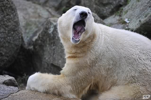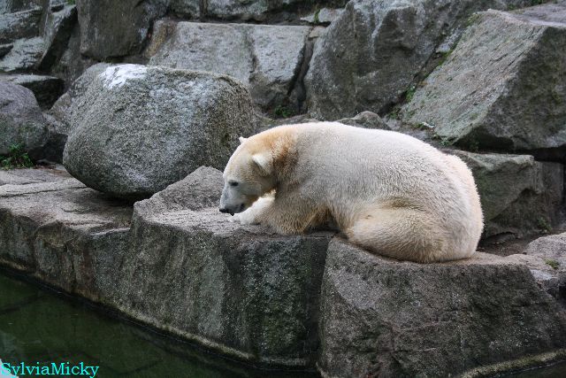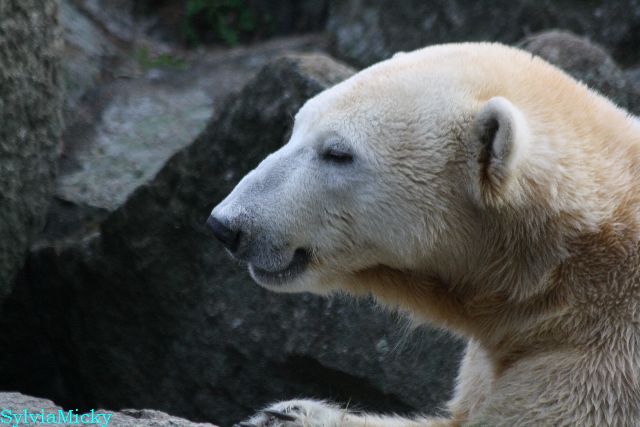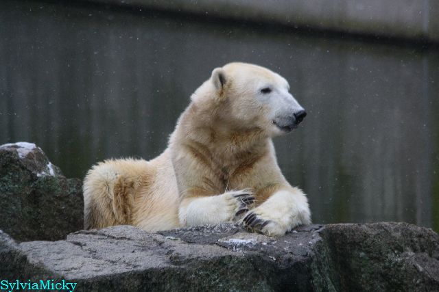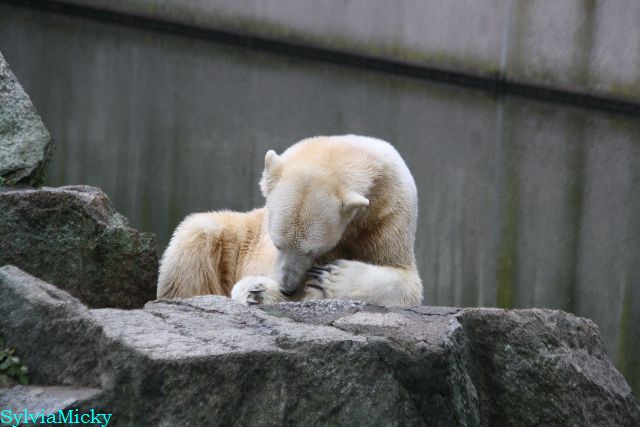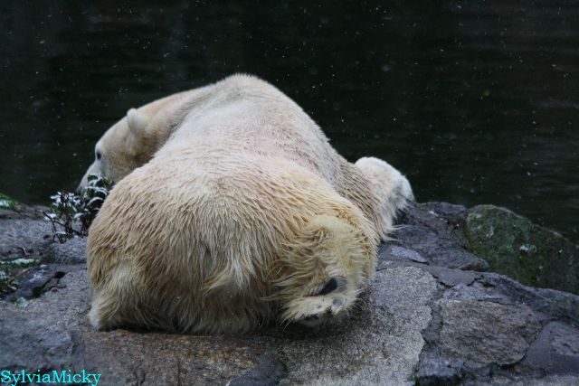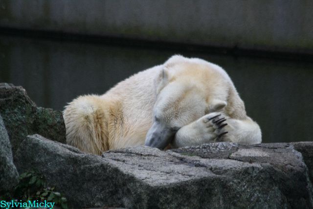 Heute früh lag Knut auf seiner Ecke. Gegen Mittag immer noch. Am Nachmittag auch. Er schaute immer wieder nach den Bären, ob sie noch da sind.