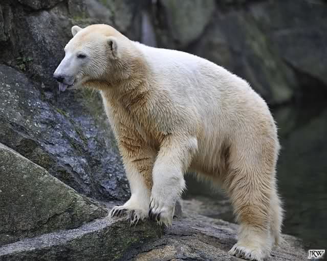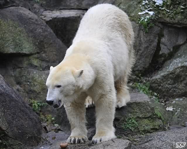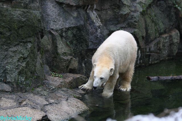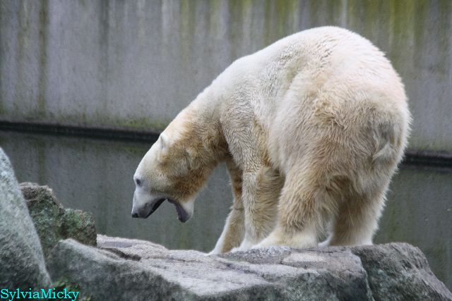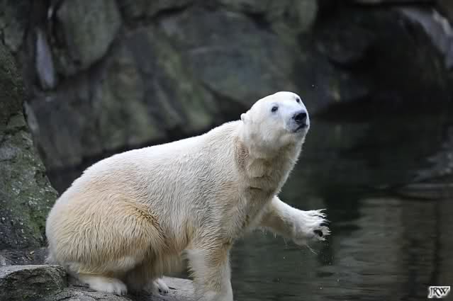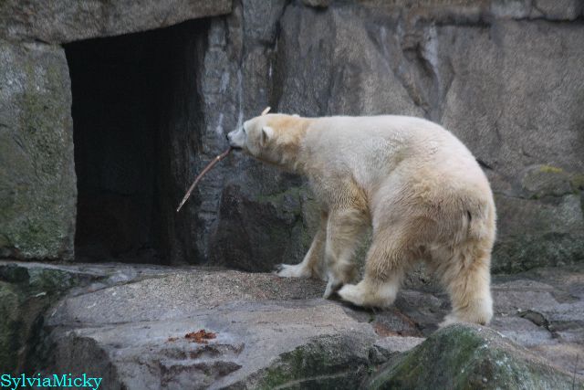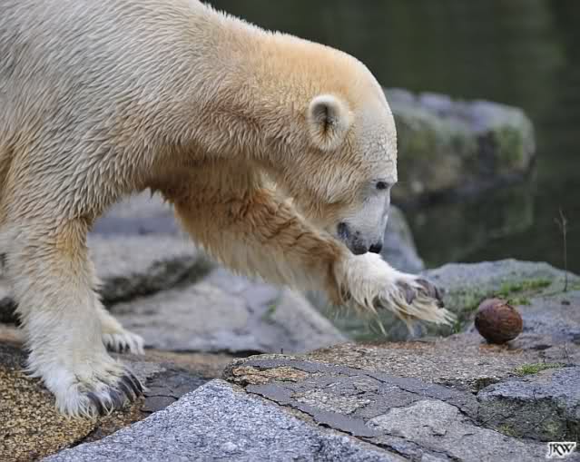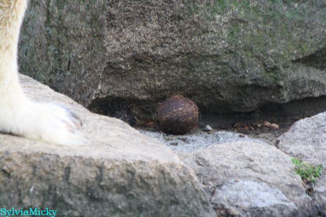 Eine Dame fragte Herrn Röbke, der auch heute wieder lange Zeit am Gehege stand und Knut beobachtete, ob Knut die Kokosnuss denn fressen würde. Er sagte wahrscheinlich nicht, aber er sollte Beschäftigung haben. Wäre es nicht schön, wenn so etwas öfter passieren würde? Der Bär wäre glücklich und vielleicht würden es die Pfleger auch genießen. Meine Daumen bleiben gedrückt und mein Dank geht ausdrücklich an MR für diese für ihn so kleine, für den Bären jedoch riesengroße Geste. Die Bärinnen würden sich bestimmt auch über Kleinigkeiten freuen.