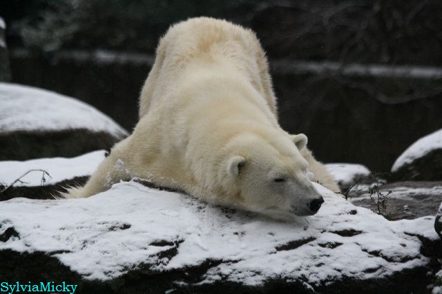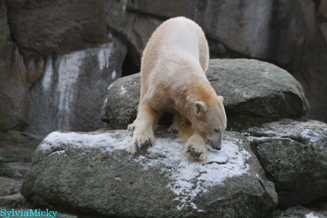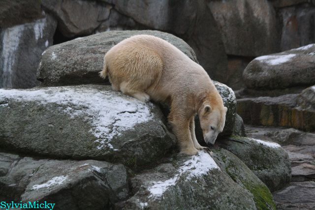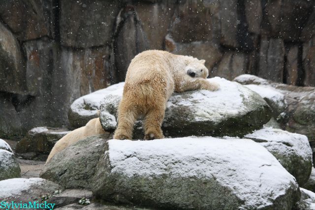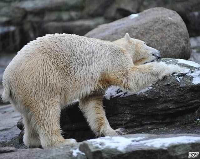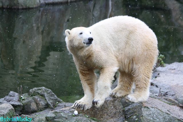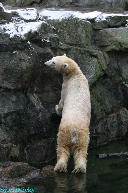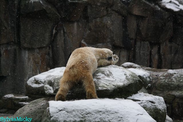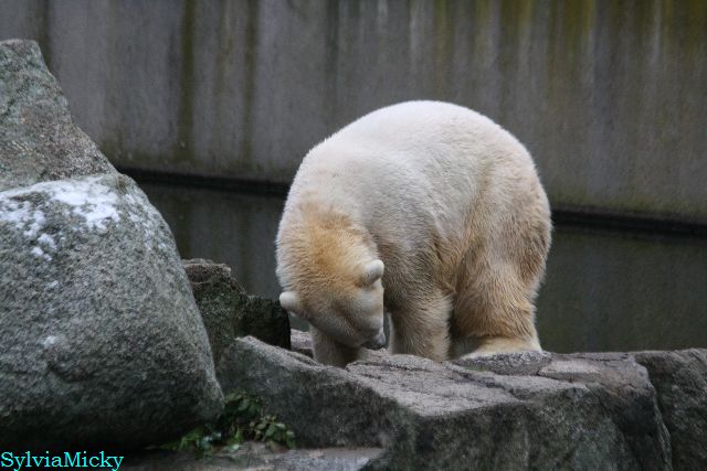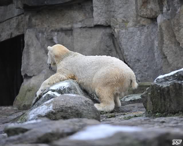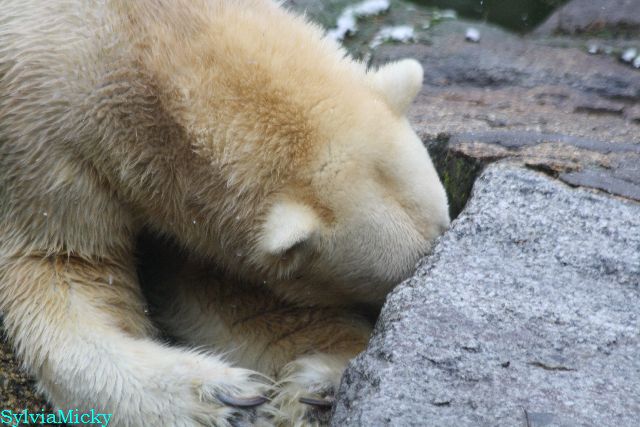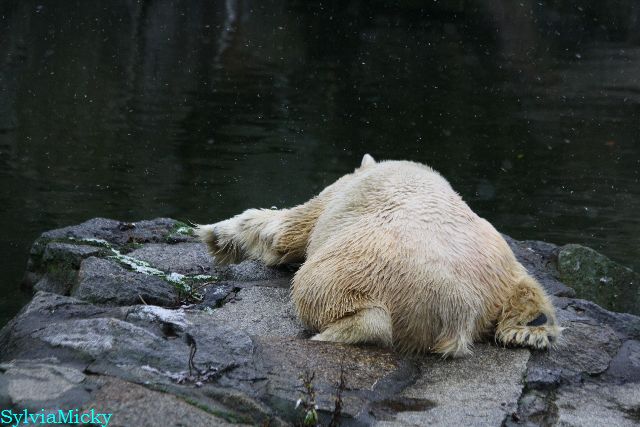 Kleinigkeiten, die einen Bären glücklich machen. Gestern ein Kürbis außerhalb der normalen Fütterungszeit und heute eine Kokosnuss. Wieder brachte Herr Röbke Knut ein kleines Geschenk. Die Kokosnuss! Und wieder versuchte Knut lange Zeit sie heranzupaddeln. Auch das gelang wieder nicht und er ging ins Wasser um sie zu holen. Danach spielte er lange damit auf der Toska-Insel, jonglierte mit ihr herum und als sie ins Wasser fiel, sprang er hinterher und spielte dort ausgelassen weiter. Später fand er sein T-Shirt und wirbelte es durch die Luft. Er sah glücklich und zufrieden aus. Der Schnee gefällt ihm auch wieder. Er legte sich über die Felsen, wischte und leckte den Schnee ab. Wie sagte das kleine Mädchen vor langer Zeit? Knut ist ein Zauberbär! Das ist er und wird es, wenn man ihm die Gelegenheit gibt, auch immer bleiben.