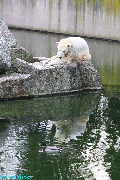 Ein Entenpärchen schwamm im Wasser. Ich glaube, Knut wäre gerne hinter her geschwommen aber er traute sich nicht.