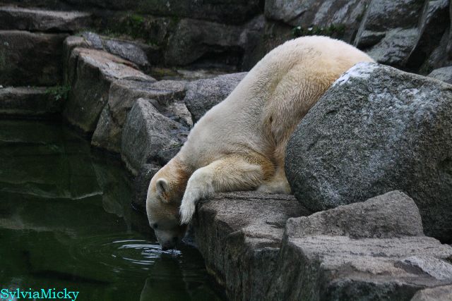 Als die drei um 15.00 reingegangen sind, ging er erstmal zu einem flacheren Stein und trank. Mein Eindruck ist, daß er von seinem Liegefelsen nicht trinken kann. Er ist zu hoch.