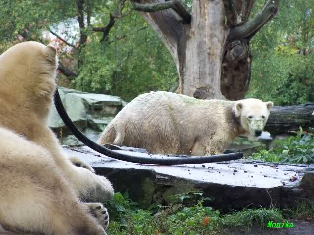 Nach dem Tierpark müssten wir natürlich schnell noch einmal bei den Beiden vorbeisehen. Auch nachmittags spielte sie kurz mit dem Schlauch und Knut schaute aus sicherer Entfernung zu. Als sie ihn liegen ließ, beschnupperte er ihn wieder, nahm ihn jedoch nicht auf. Zu dieser Zeit regnete es schon wieder und keiner der beiden Bären sah besonders glücklich aus.