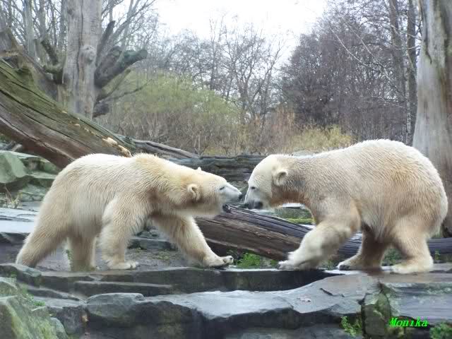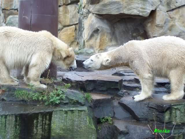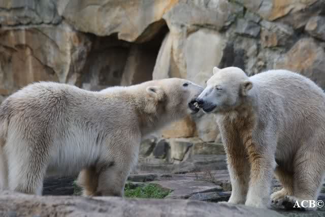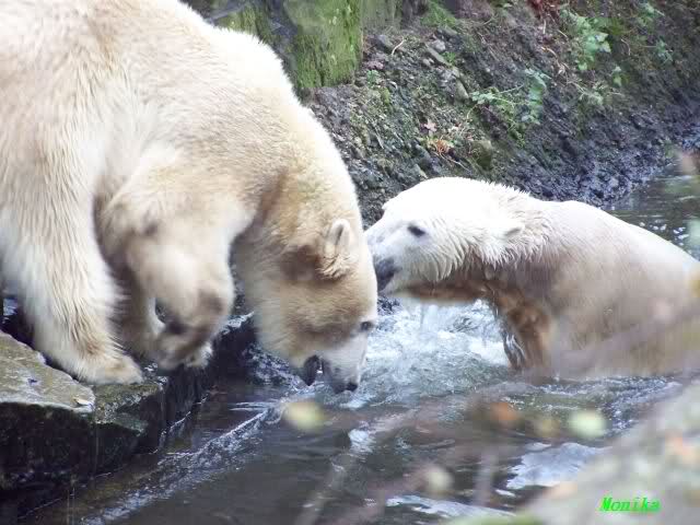 Knut und Gianna störte das alles nicht. Sie waren allerbester Laune. Knut war in seinem Graben und schwamm. Gianna behielt ihn vom Felsen aus genau um Auge. Als Knut das Wasser verlassen wollte, kam Gianna angerannt und es gab eine Menge bäriger Küsschen.