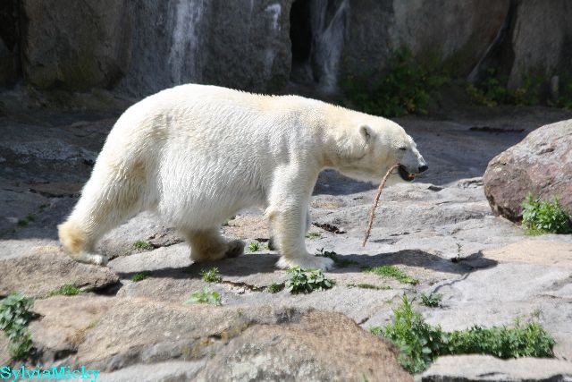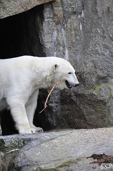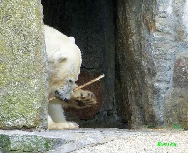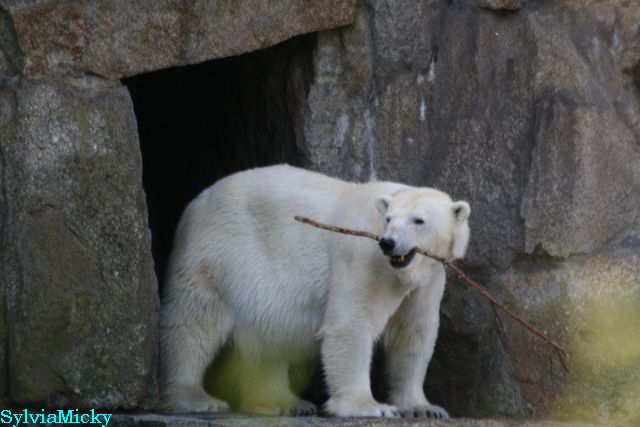 Nach der Fütterung fand Kati noch einen Stock, den sie über die Anlage in ihre Höhle trug.
