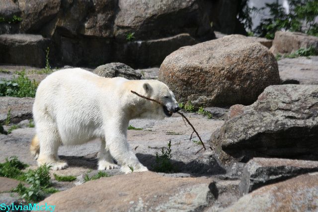 Nachmittags lief Tosca nicht. Sie ging in Kati’s Höhle und legte sich hin. Nancy kam dazu und konnte endlich an Tosca’s Ohren schlecken. Wir haben uns gefreut. Diese Freude dauerte nicht lange. Nachdem Kati kurz allein mit einem frischen Zweig spielte und immer wieder nach oben zu den beiden anderen schaute, wollte sie nach ausgiebigem Schubbern und Kratzen zu den Beiden gehen. Plötzlich schoss Tosca aus der Höhle und griff Kati brüllend ein zweites Mal an, die sich natürlich wehrte. Die Stimmung zwischen den Bärinnen war danach endgültig hinpber und jede suchte sich einen eigenen Platz. Als wir kurz vor 20:00 mit einer Führung bei dem Eisbärenfelsen vorbeikamen, lief Tosca in der Abendsonne auf ihrer Insel frenetisch hin und her, Kati lag auf Knut’s Seite und Nancy war nicht zu sehen.