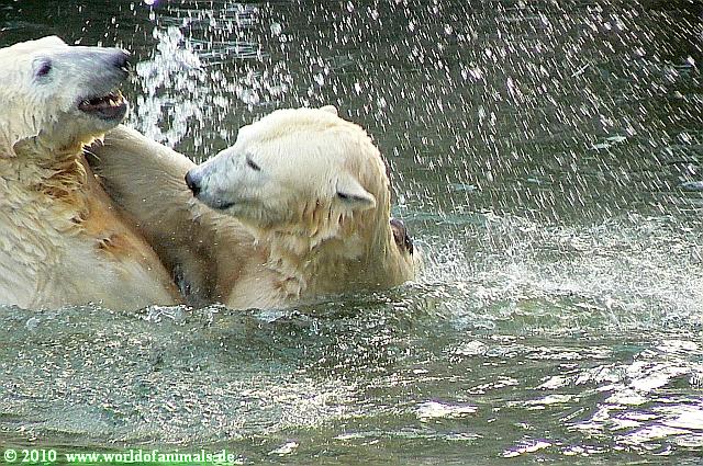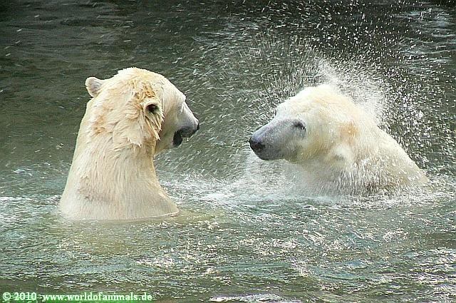 Knut lag in seiner kleinen *2 qm Wohnung* und wachte darüber das sich keine der großen Bärinnen in seine Nähe begab. Tosca tat es trotzdem und Knut zog sich in die äußerste rechte Ecke der Anlage zurück. Tosca folgte ihm zunächst mit Nancy, aber die zog sich auf die Anlage zurück. Nicht so Tosca. Es kam zu mehreren Kontakten mit der Schnauze mit Knut. Plötzlich rutschte Tosca aus und plumpste ins Wasser. Das war der Auftakt zu einer ausgelassenen Wasserschlacht. Die Freude bei den Besuchern und auch bei mir war groß, hatte ich dies noch nicht live gesehen. Die folgende Fotoserie zeigt einige der vielen Fotos die heute entstanden sind (26 ausgesuchte Fotos sind es heute mal).