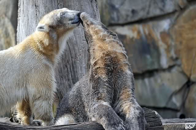 Heute morgen war es noch ruhig auf dem Bärengehege. Im Laufe des Vormittags wurden Knut und Gianna doch noch munter und spielten ausgelassen im Wasser.