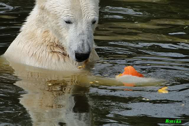 Zur Fütterung gab es einen halben Kürbis, den Knut sofort im Wasser verspeiste, bevor Gianna raus kam.