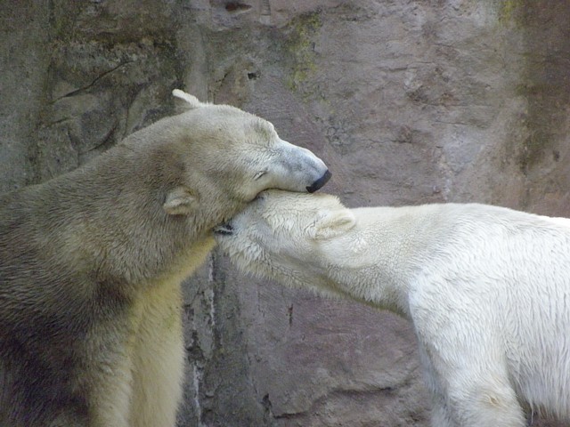 Heute Morgen bin ich schon sehr früh in den Tiergarten gefahren und habe so nicht mehr gelesen, dass Felix schon wieder da ist. Ich habe erstmal drei Stunden bei anderen Tieren verbracht und bin dann mit sehr gemischten Gefühlen in Erwartung eines leeren Geheges in den Aquapark gegangen. Ich habe mich schon gewundert, dass Leute vorm Gehege standen und dachte, dass Vera vielleicht jetzt beide Seiten nutzt, bis ich dann gesehen habe, dass sich zwei Bären in der Anlage befanden, Vera auf ihrer üblichen Seite und tatsächlich Felix auf der anderen. Ich habe dann gleich eine liebe Bekannte getroffen, die mir sofort erzählt hat, dass Flocke und Raspi gut angekommen sind, was mich sehr erleichtert hat. Und die Aussage, die man heute lesen konnte, von wegen Raspi hätte geschrien und getobt, war wohl auch etwas übertrieben. Möglicherweise dachte er, dass er nun allein irgendwo hingekarrt wird, er hatte das ja schon mal. Wie mir von Leuten berichtet wurde, die gestern ebenfalls dort waren, hat er sich beruhigt, als auch Flocke im Auto war.