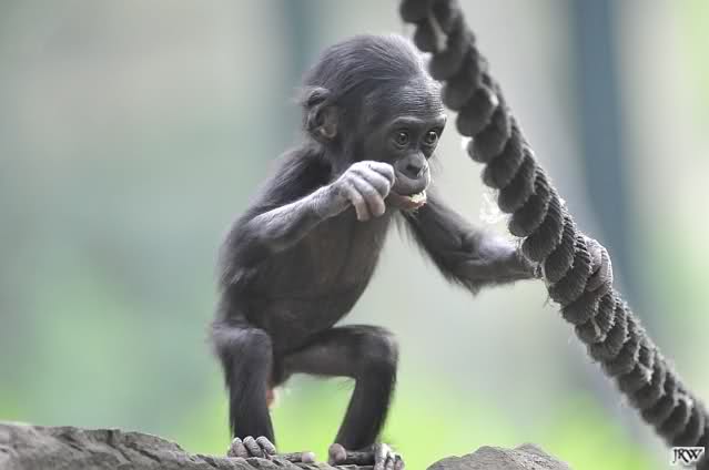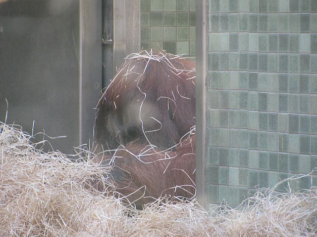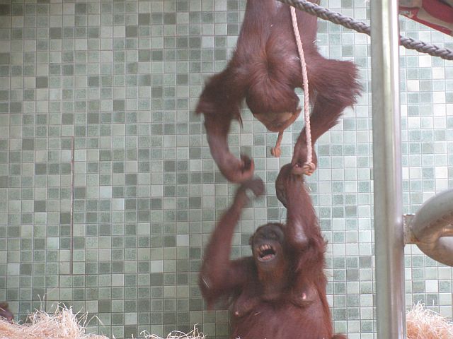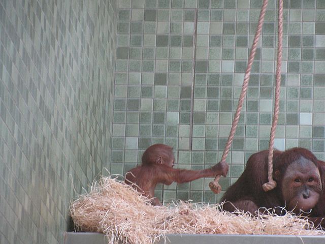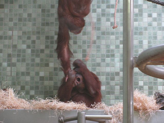 Manu sah den beiden zu, bis er von Bagus eine Ladung Holzwolle über den Kopf bekam. Manu ist ein ganz gutmütiger Papa