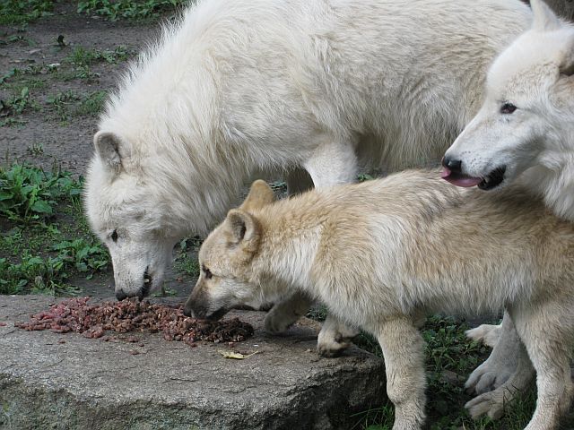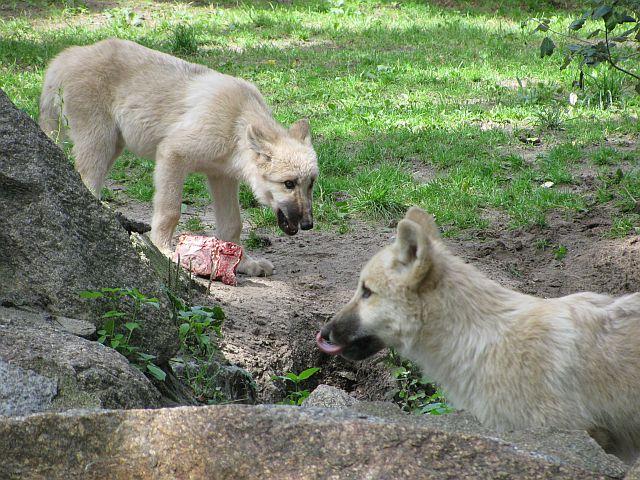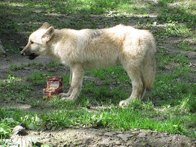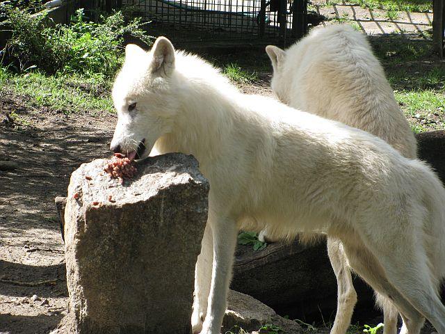 Bei der Fütterung bringt Tosca 2 Stück Fleisch und einen Stock an Land