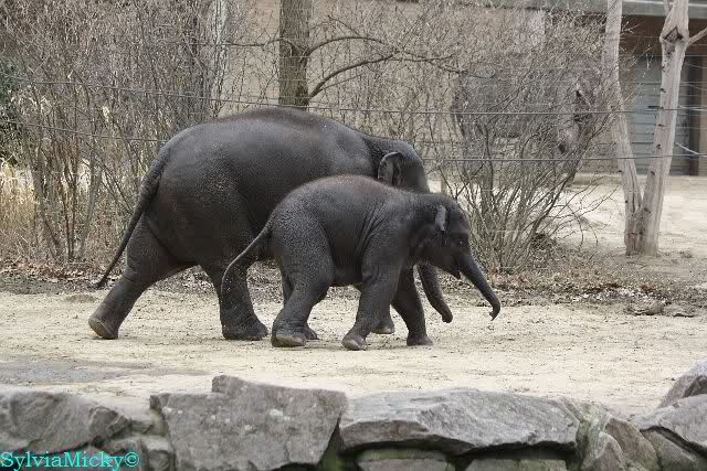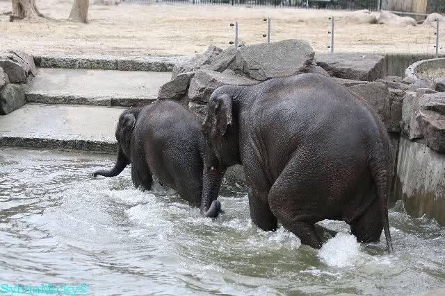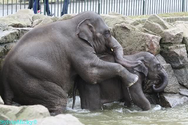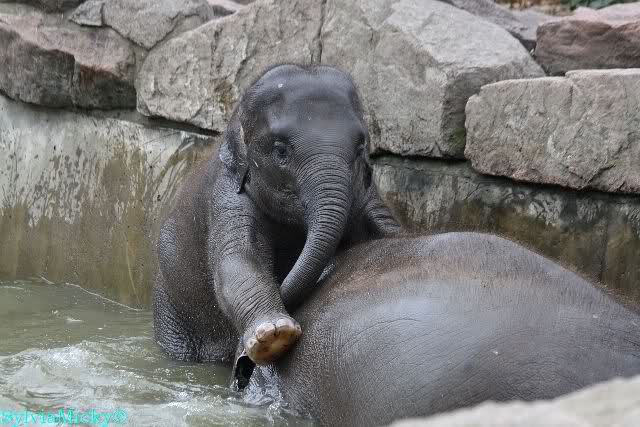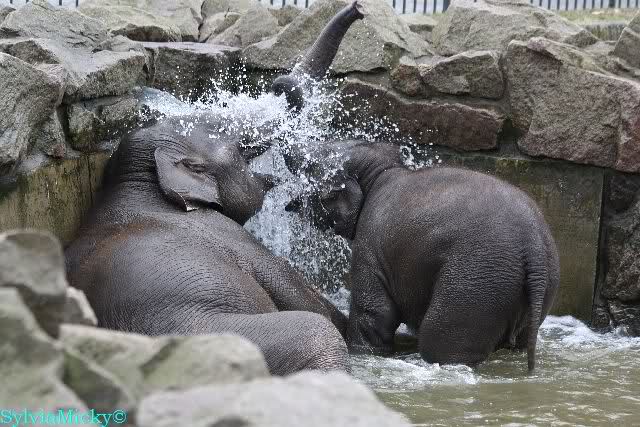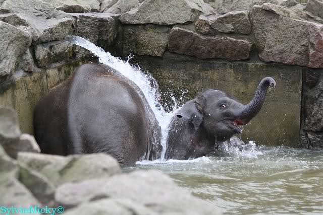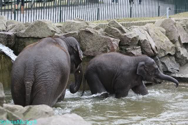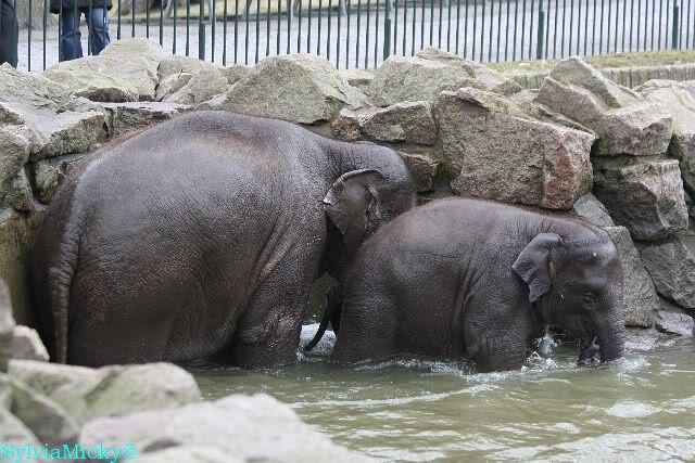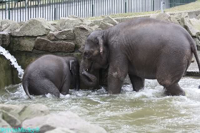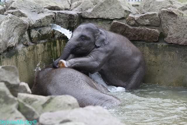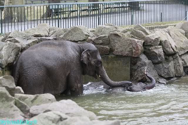 Als Shaina Pali genug hatte schob sie Ko Raya aus dem Wasser. Die wollte aber nicht und lief wieder rein. Die ganze Prozedur wiederholte sich ein paar Mal. Erst als Shaina laut trompetete lief Ko Raya ganz brav mit ihr mit.