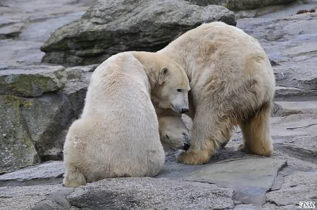 Dear Monika and Sylvia, many thanks for your great pictures of today. The little lambs are indeed adorable, but the greatest joy was to see Ko Raya and Shaina Pali in their swimming pool. While watching these pics, nobody can have any doubt that the little girlie adored to play around in the water and sweet little big sister (Shaina Pali is absolutely one of my dearest favorites) is keeping an eye on her. Oh my, I wished I was there today. And our old dear Lady Jana is also looking good. Please, shall we now say a little prayer that Spring will finally arrive so that we all can enjoy more of these moments. Well, Monika, I know that it is becoming a bit difficult. You want the snow and the Winter to continue for a while because of Knut (a thing that Doris certainly does not want), but on the other hand, like Sylvia already said, his beard is growing thicker and larger (a thing that I like and others as well and some others not at all). That seems to me to be a fair deal, no? But nevertheless, we still have to go through the April showers, so I suppose that all of us will get a share of what we want.