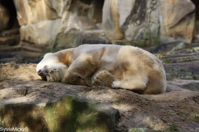 Knut und Gianna verschliefen den ganzen Vormittag. Später lief Gianna wieder über die Anlage. Einige kurze Nasenkontakte gab es auch. Das Gehege von Knut war schon lange vor der Fütterung gut besucht. Wie auch der gesamte Zoo.