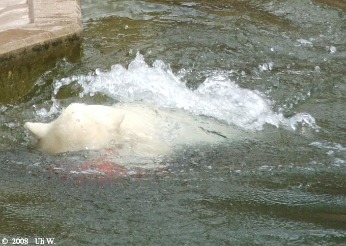 29. April 2008: Kaum aus dem Wasser hat sich Flocke wieder frisch paniert. Vielleicht wollte Flocke lieber ein Braunbär werden, wer weiß? Sie mag jedenfalls nicht auf ihr regelmäßiges Sand- und Krümelbad verzichten. (Foto: Ralf Schedlbauer)