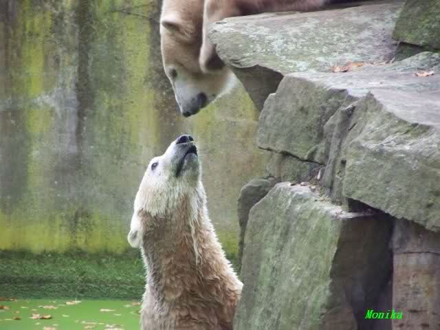 Auch ich war heute Nachmittag im Zoo und habe die nachfolgenden Bilder mitgebracht, so wie ich die beiden heute auf den Chip gebannt habe. Erstmals konnte ich das live erleben, was ich nur von den Fotos der letzten Tage kannte: Den Bär-zu-Bär-Kontakt der letzten Tage.