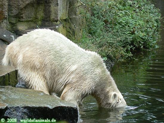 Knut war heute sehr gut drauf, als ich gegen 12.00 im Zoo war. Er spielte mit seinem neuen Ball im Wasser. Allerdings hatte der Ball sehr schnell seine Form verloren. Dann raste er von einer Seite zur anderen Seite seiner Anlage und sprang von einem Felsen ins Wasser. Es war schön ihn so zu sehen.