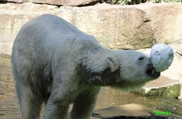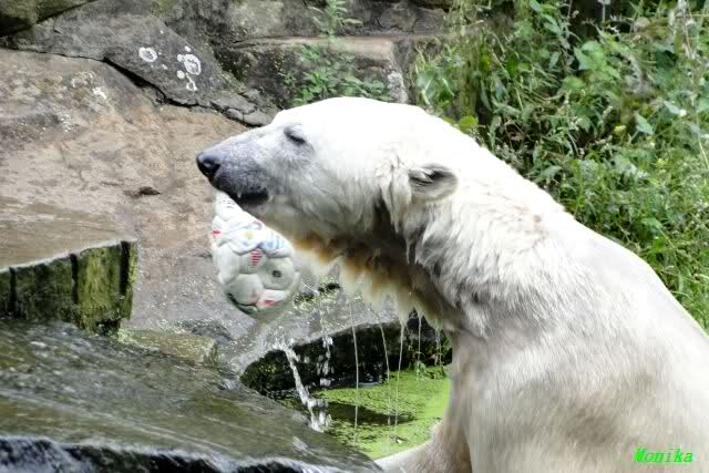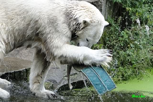 Heute jedoch spielte Knut wieder ausgelassen mit seinem Spielzeug, nachdem er bis kurz vor 12.00 Uhr geschlafen hatte. Langsam wird unser Kleiner größenwahnsinnig. Nachdem er den Ball ein paar Mal zu den Besuchern geworfen hatte, wollte er es mit dem großen Baumstamm probieren. Was ihm natürlich (Gott sei Dank) nicht gelang. Sogar sein Nackthuhn fischte er heute aus dem Wasser. Kurz vor der Fütterung fing es sehr stark an zu regnen, also blieb Knut gleich im Wasser uns spielte fröhlich weiter.