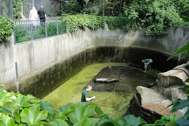 Aber leider hatten wir heute wenig Zeit. Nachdem wir Knut eine Weile beim Baden zugesehen hatten, gingen wir dann zum Ausgang. Ich blieb noch ein wenig im Zoo und ging zu BaoBao. Der bot ein interessantes Schauspiel. BaoBao hatte frischen Bambus bekommen. Den verspeiste er, auf dem Rücken liegend und die Beine hoch in die Luft gestreckt. Viele Leute standen dort, fotografierten und freuten sich über das drollige Bild.