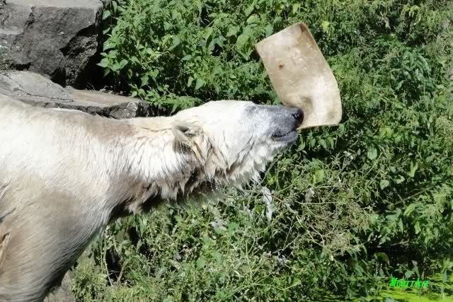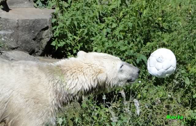 Heute hat Knut jedenfalls noch seelenruhig bis mittags geschlafen. Dann drehte er wieder voll auf. Die Besucher wurden ständig beschäftigt. Mal flog der Ball und mal der Lappen(ehem.Kauknochen). Das Spiel ging bis kurz vor der Fütterung. Irgendwie genießt man das ausgelassene Spielen noch intensiver als sonst, weil man ja nicht weiß, wie lange Knut noch so ungetrübt seinen Spieltrieb genießen kann.