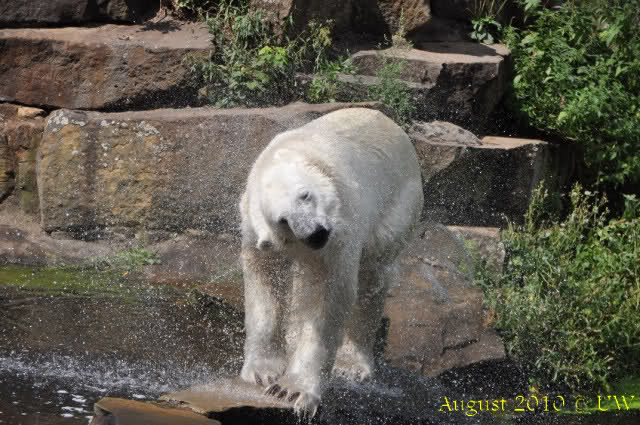Dann gingen wir wieder zu Knut. Der war endlich erwacht. Das Fell war auch hübsch gefärbt, halb weiß, halb dunkelgrau. So konnte man sich dem Publikum präsentieren. Die Besucher riefen, Knut solle ins Wasser gehen. Zum Glück macht er immer noch, was er will. Aber nachdem er eine Weile mit den Tatzen im Wasser geplanscht hatte, ging er dann doch ganz hinein.
