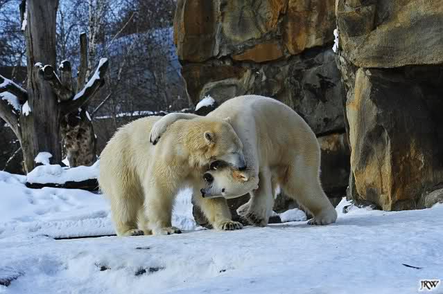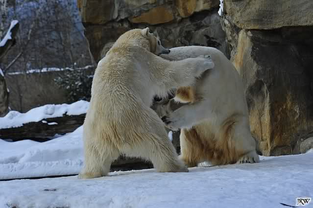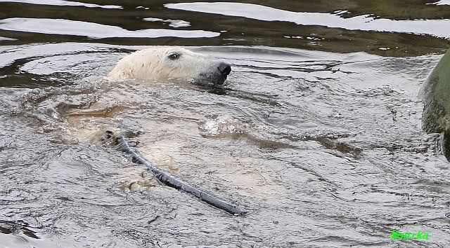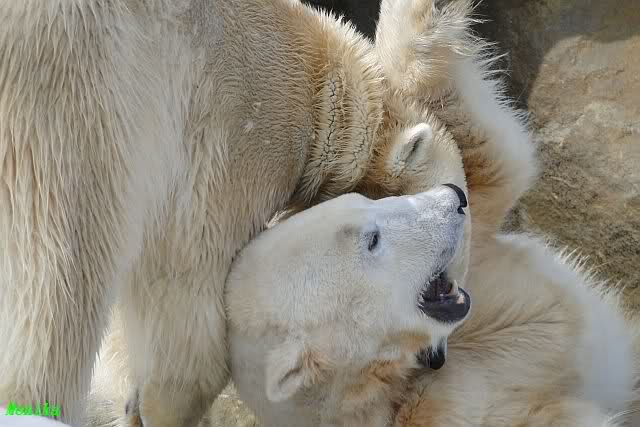 Knut hat sich heute für seine Sonntagsgäste etwas geschminkt. Die Sonne animierte beide zum spielen und schmusen. Heute Morgen war Knut noch am schlafen und Gianna lief ihre Runden, bis sie ausrutschte und ins Wasser gleitete. Da drehte sie dann wieder richtig auf. Sie sprang vom Felsen und spielte im Wasser mit dem Schlauch. Knut schaute von oben zu. Anschließend wurde der Baum von Gianna bearbeitet. Sie hat schon eine ganze Menge Rinde abgekaut. Knut machte inzwischen Bärengynastik und versuchte die Aufmerksamkeit von Gianna zu bekommen. Was ihm dann auch öfter gelang. Als Gianna ihn dann ignorierte postierte er sich vor dem Höhleneingang, wo sie ständig hin lief. Auch diese Rechnung ging auf. Im Vorbeigehen gab es dann immer wieder süße Begegnungen.