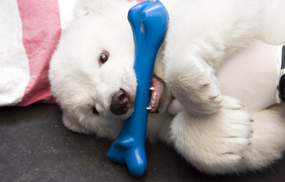 Was für Hauer! Noch sind es ja kleine Milchzähnchen, die sich in den blauen Plastikknochen bohren, aber bald wird das ein richtiges Raubtiergebiss werden. (Foto: Ralf Schedlbauer)