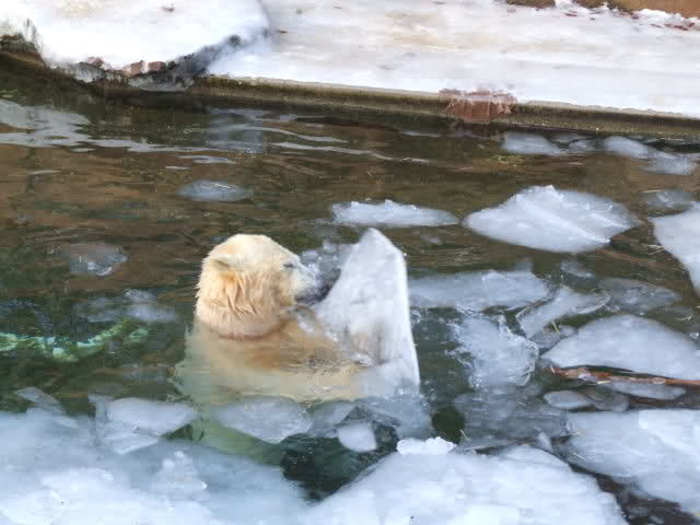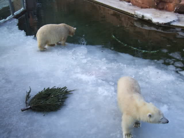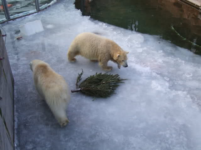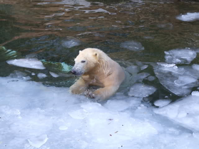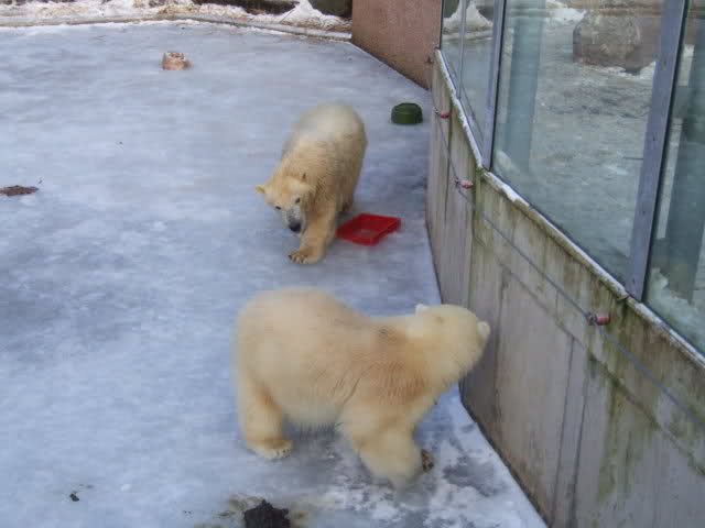 1:0 also im Eisbärengehege. Doch dann lässt Flocke von dem ersten Eimer ab und macht sich an einen zweiten heran. Sichtlich genießt sie es, auf dem alten Plastik herumzukauen, ihre Außenwelt hat sie ganz vergessen. Das ist die Chance für den kleinen Russen: Diesmal stürzt er sich ohne Ankündigung auf die völlig gedankenverlorene Flocke und jagt ihr den Eimer ab. Der Ausgleich, 1:1. Doch anstatt nun selbst mit dem Eimer zu spielen, wirft Rasputin seine Eroberung einfach in den Pool und macht sich von dannen.