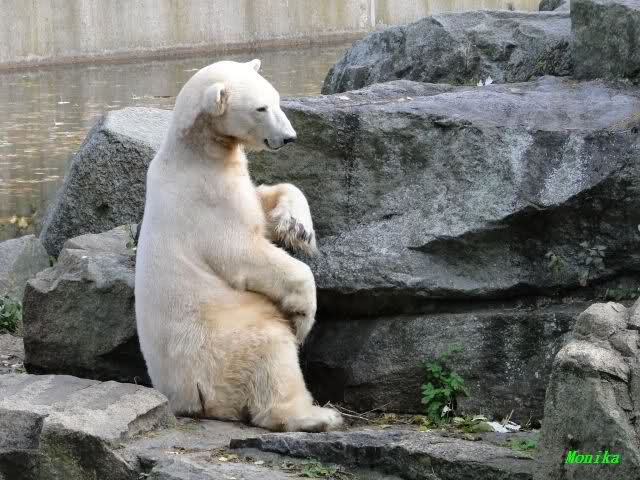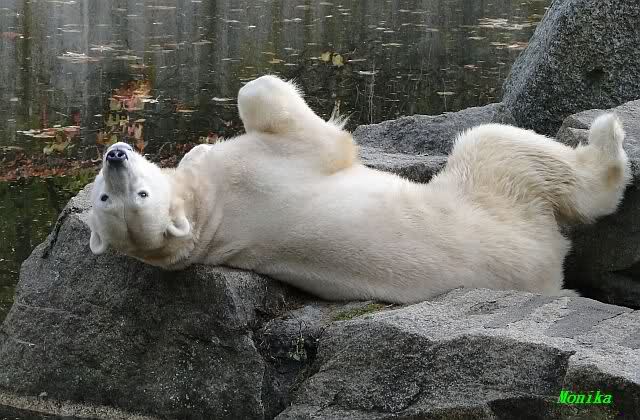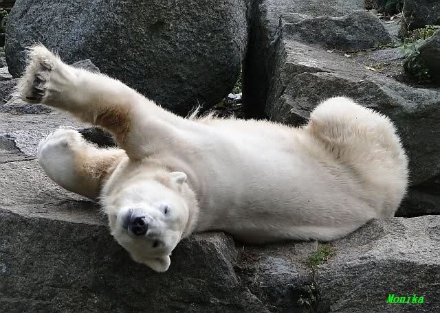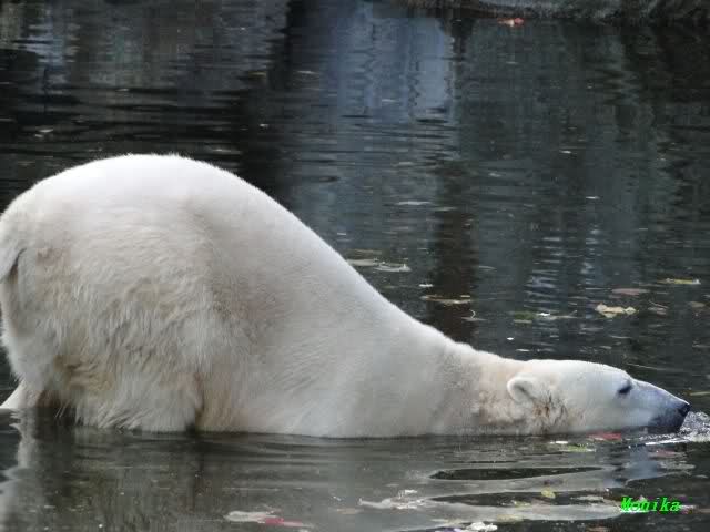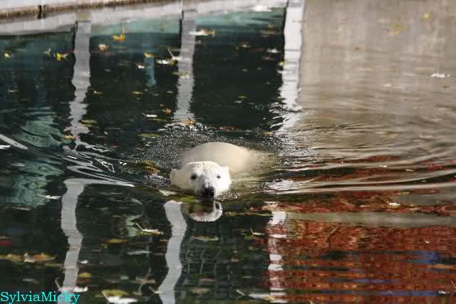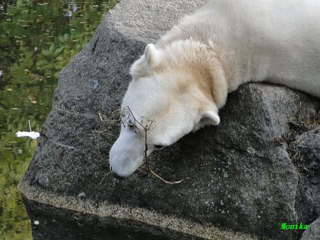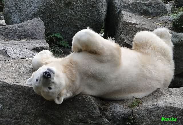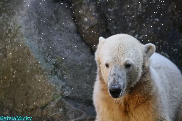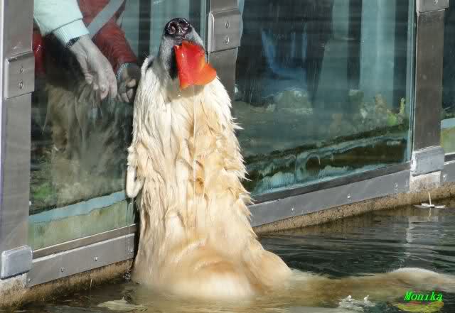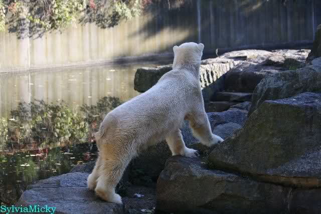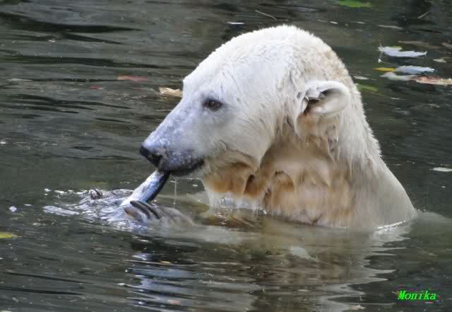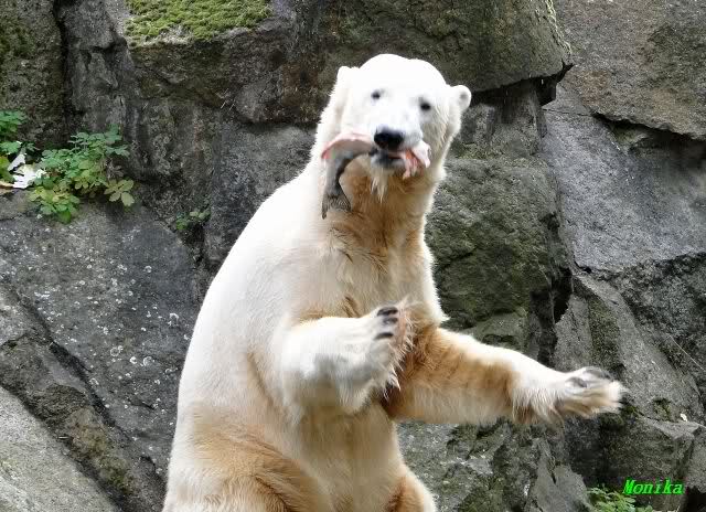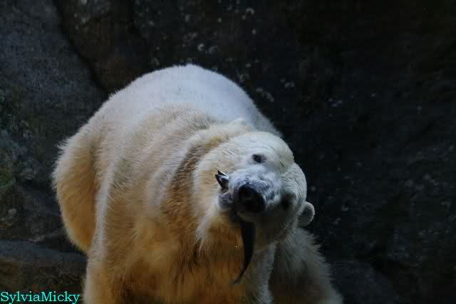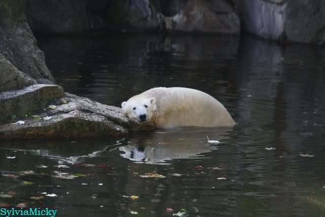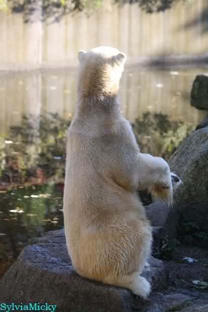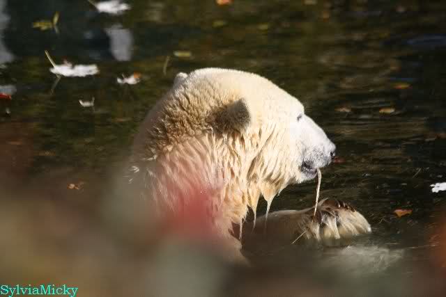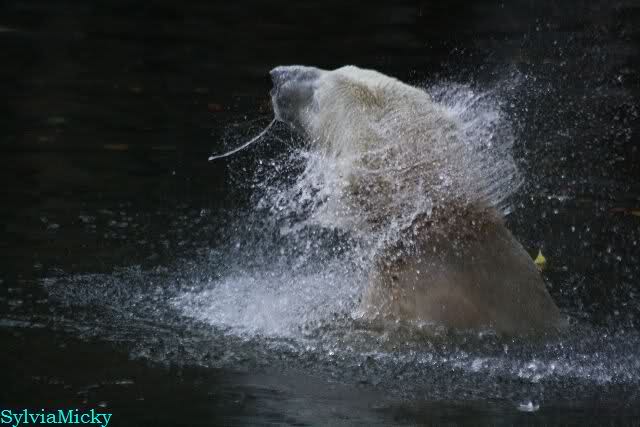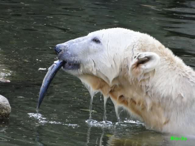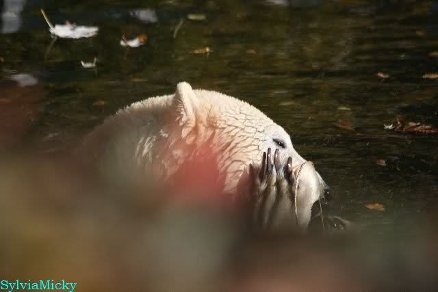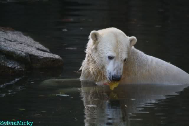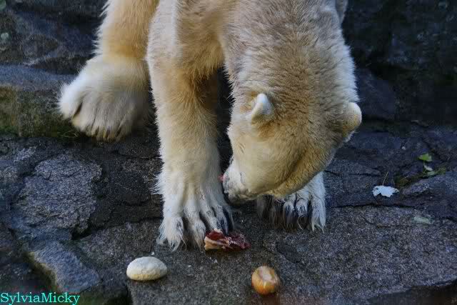 SylviaMicky, Monika - Thank you so much for showing us the latest photos of our boy. Knuti still has his baby face and looks so happy to meet the visitors. I was also happy to see he got a big salmon. Monika, your video makes me sleep better tonight. I love to hear the mantra 'Knut geht's gut'!!! I hope I can hear it every day!